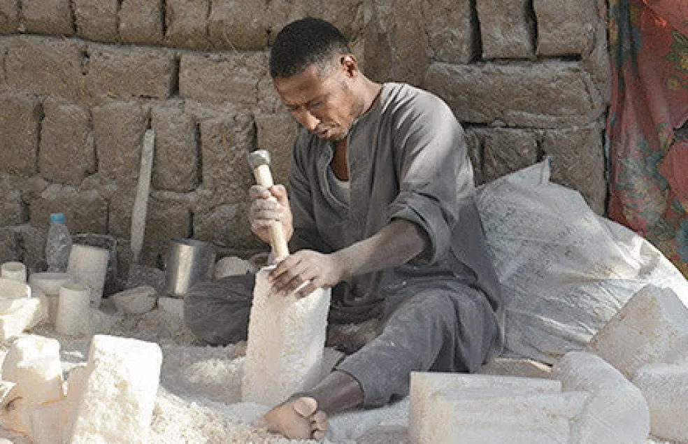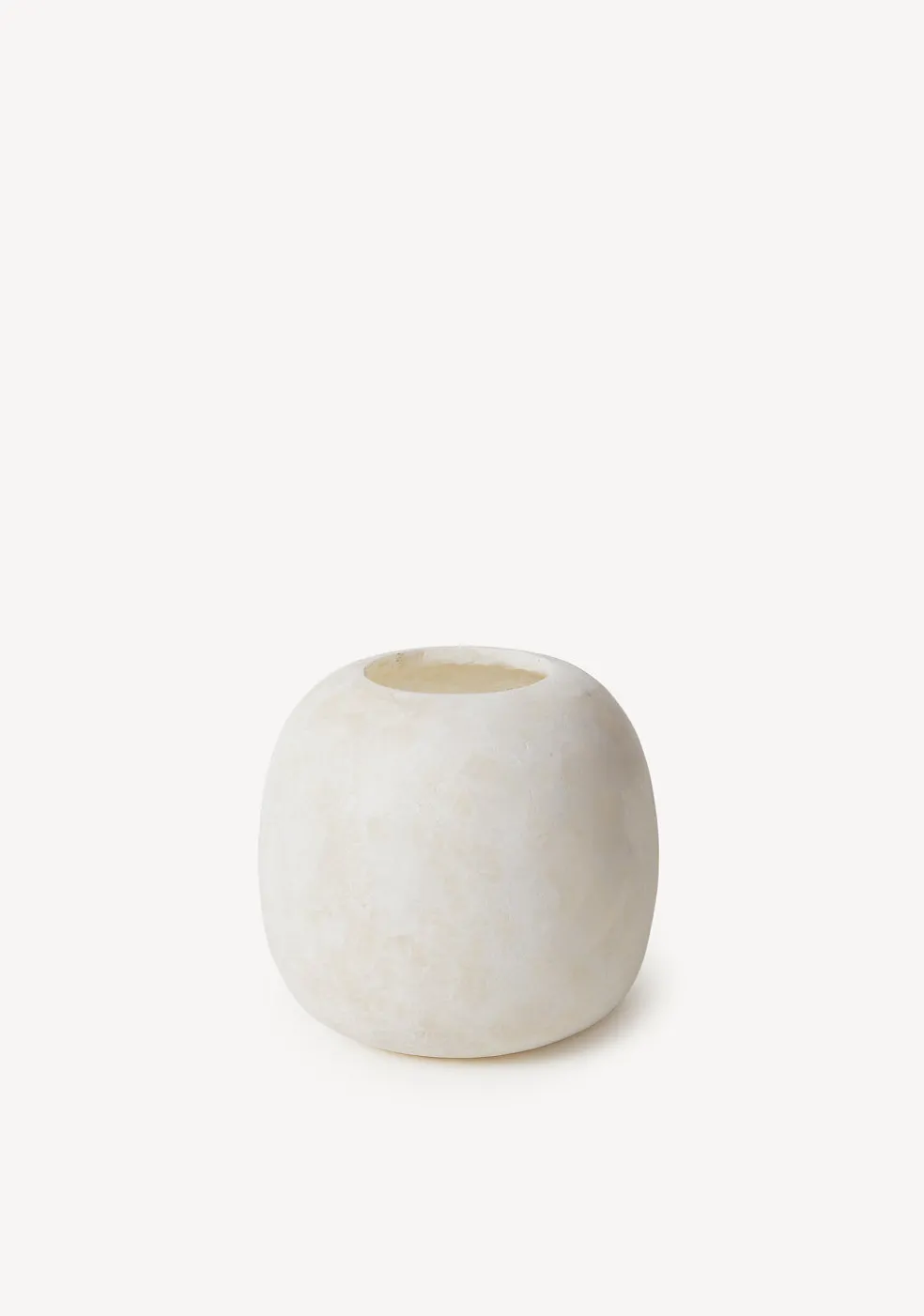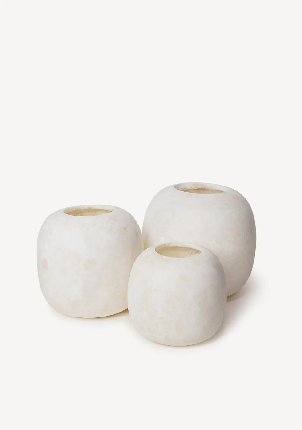 Hand-carved elegant alabaster candleholders in a delightful sphere form, radiate a warm, graceful glow at any time of day via a single tea-light. Rich with earthy minerals, these stone candleholders may slightly cary in color hue, size, and texture. Handmade by Egyptian Artisans and designed in Denmark. Product of Sirocco Living.