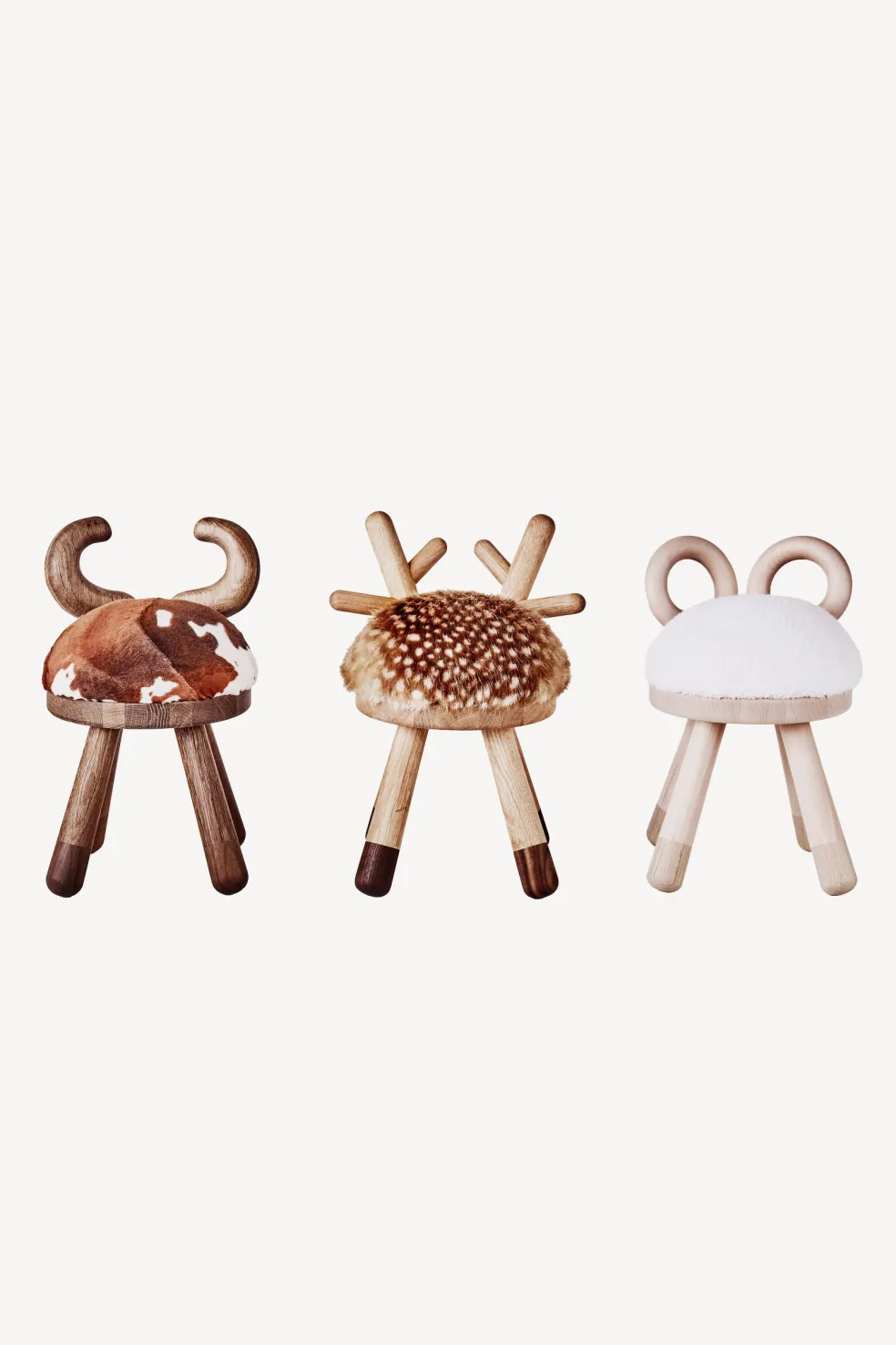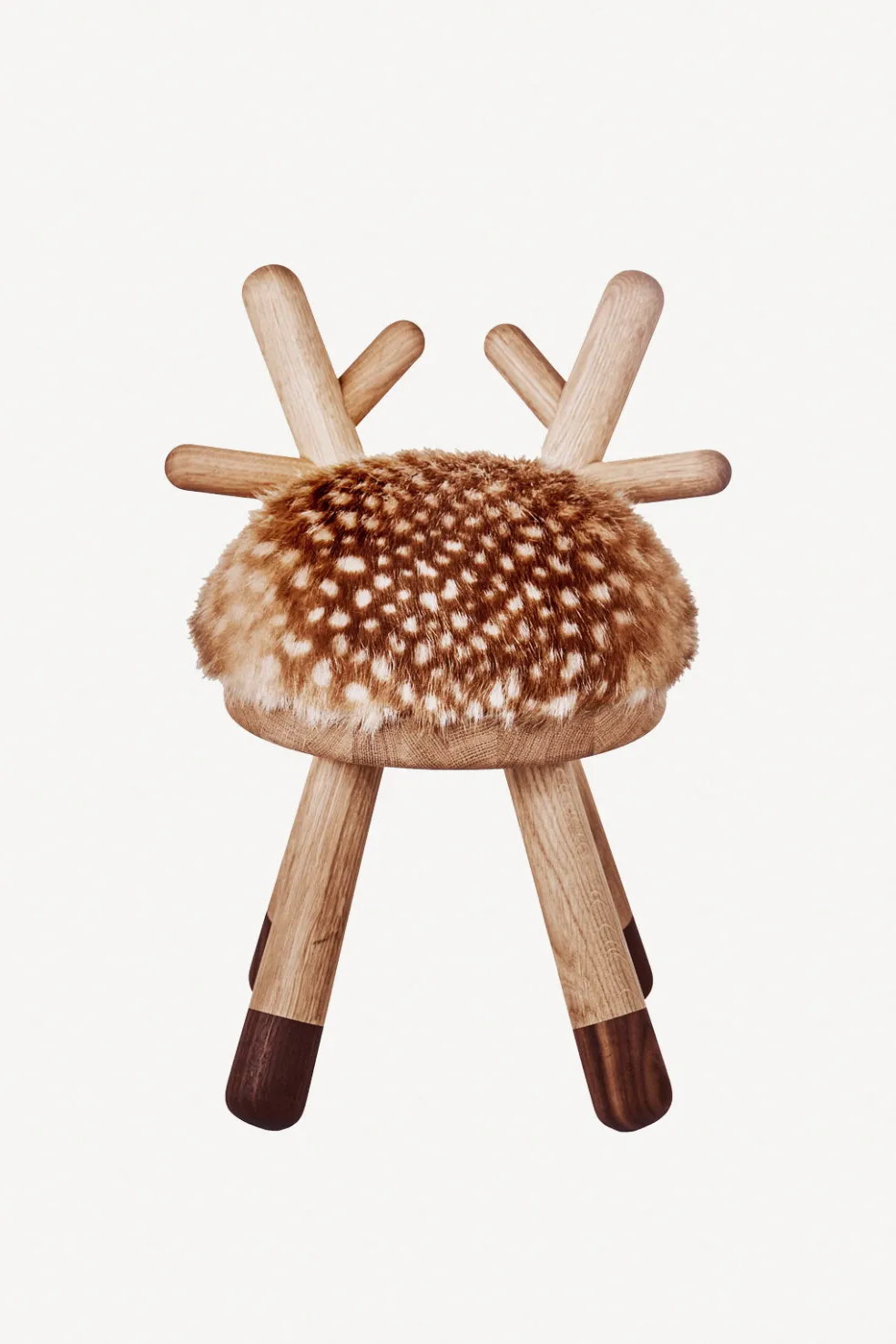 This children’s stool is a work of art and incredibly cute. Crafted from fine solid European oak and American walnut with a foam stool, and upholstered in cozy faux fur by EO in Denmark.