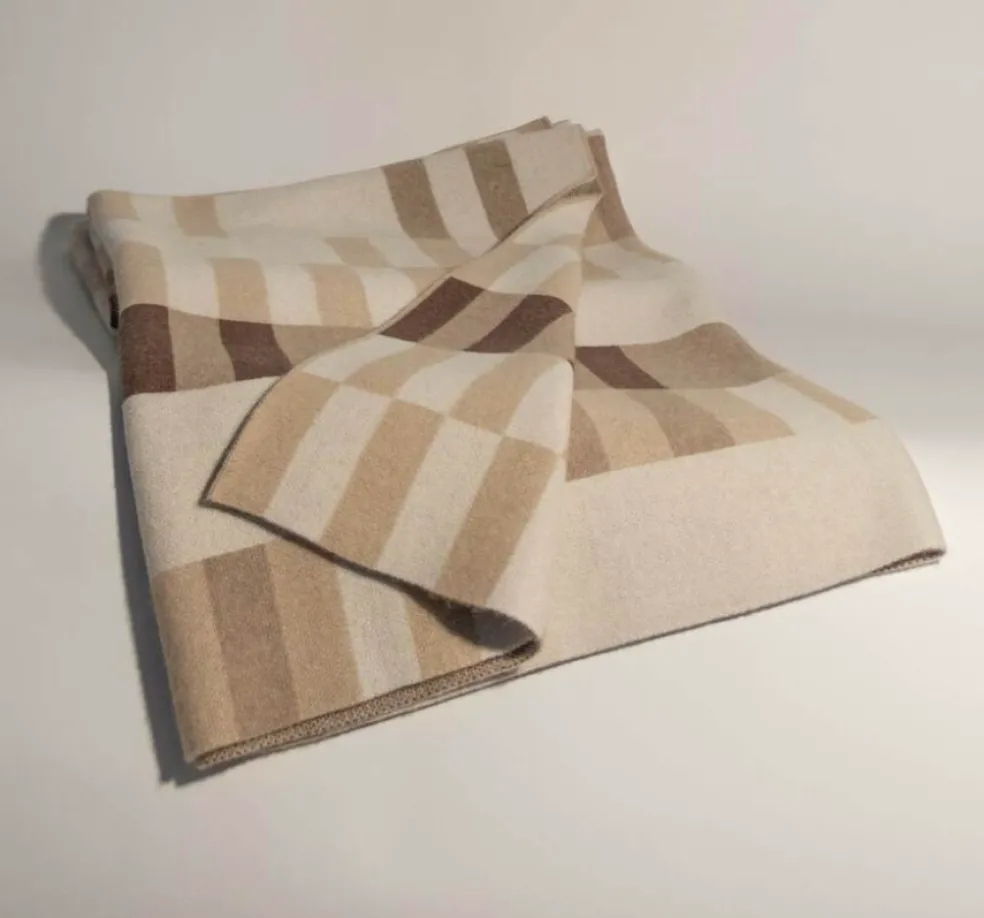 Luxuriously durable and warm throw blanket, crafted from precious Bactrian camel fiber from the Gobi Desert, is cozy, breathable, and moisture-resistant, and therefore especially suitable for all outdoor activities. Created by Hangai Mountain Textiles in Mongolia, these exquisite camel throws in a geometrical bauhaus design are perfect for indoor lounging or snowy outdoor excursions.
