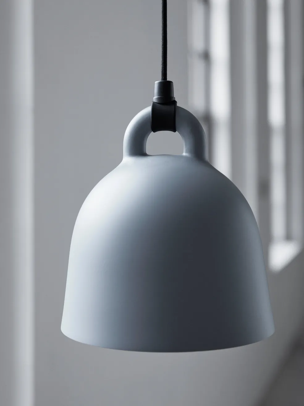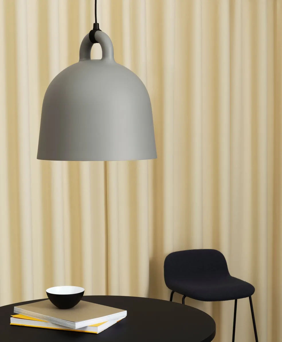 The Bell Lamp, by Normann Copenhagen, is a playfully modern take on the classic cow bell shape. Group together a mix of colors and sizes for a modern visual effect, use a large Bell Lamp as an accent pendant over the dinner table, or hang pairs of Bell Lamps for decorative kitchen lighting. Bell Lamps include corresponding textile cords and aluminum canopies, allowing them to match your unique interior design whether it be simple or bold. Low-energy 9 Watt bulbs are recommended.