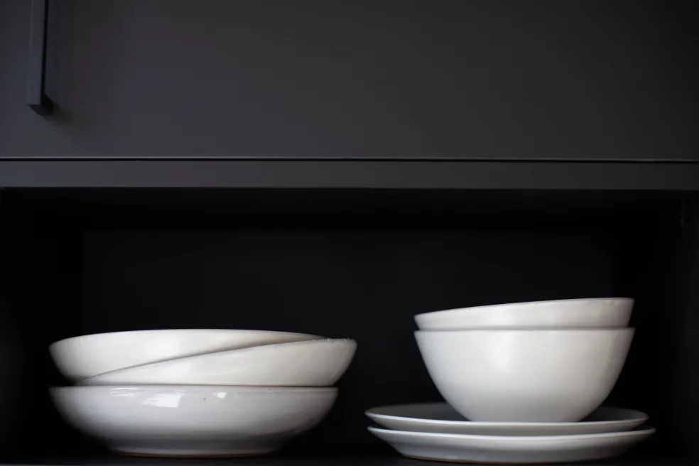 Available in two dishwasher safe finishes: (shiny) river & (matte) pebble.