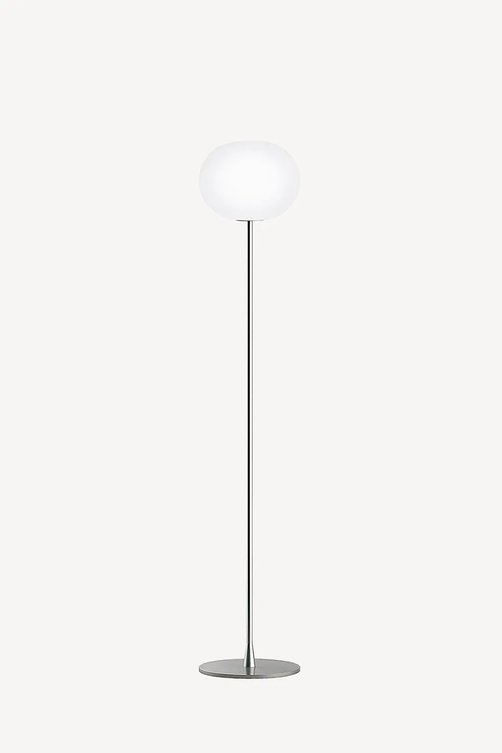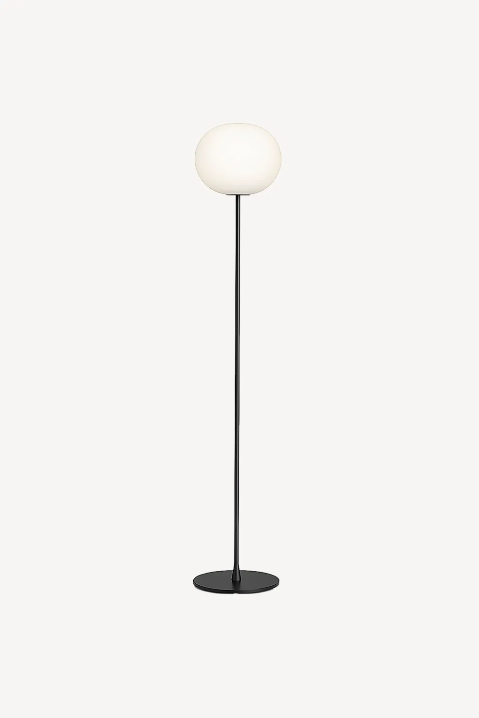 This contemporary, medium floor lamp fits naturally into any design aesthetic, emitting a warm, diffused light that is delicate yet vibrant. The dimmable Glo-Ball, a hand-blown, etched white opaline glass diffuser, is supported by your choice of a matte black or silver steel stem.