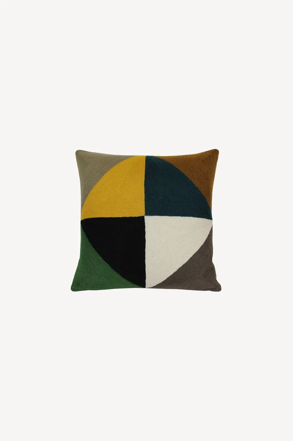 The John hand embroidered cushion in chain stitch with a geometric design and combination of colors. Each piece is a unique creation with the embroidery, weaving, dyeing handcrafted by skilled artisans in northern India and Nepal.