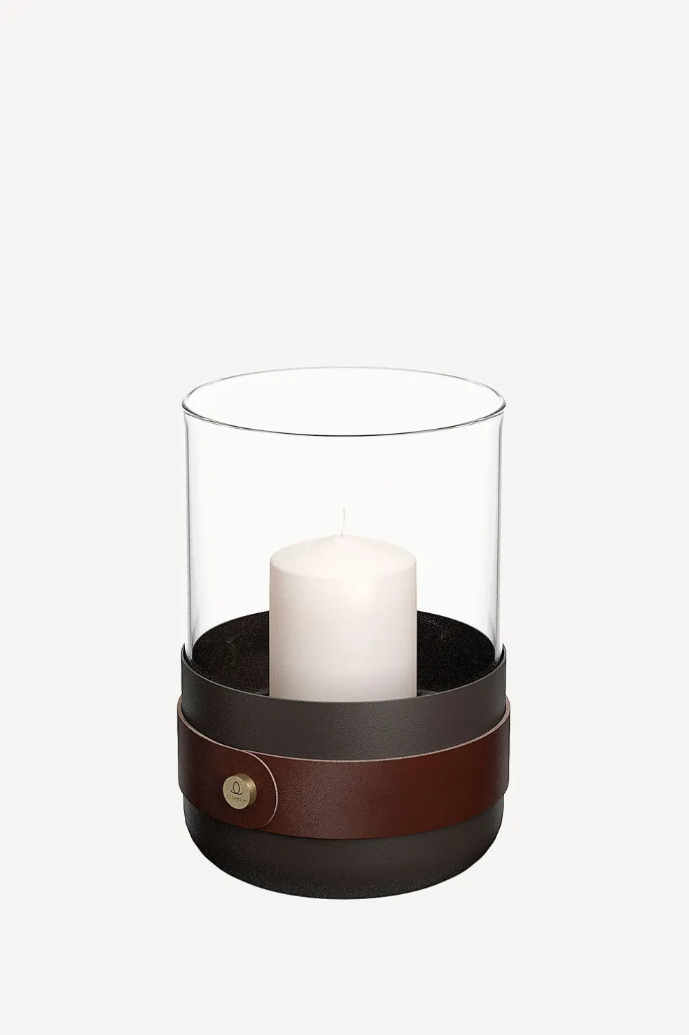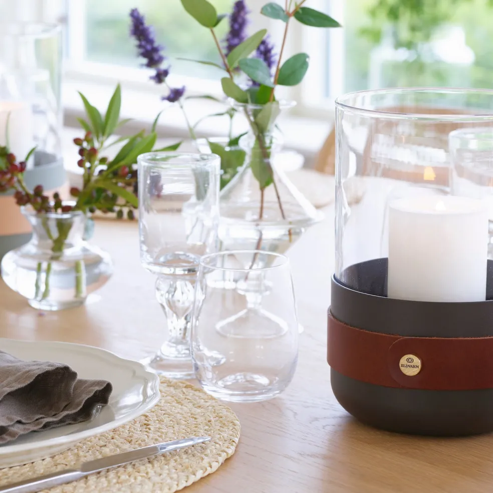 The Emma lantern is artfully crafted from an earthy brown powder-coated steel, as well as rich cognac leather, hand-blown glass, and solid brass detailing. Available in a variety of luxurious color finishes. Designed in Sweden by Emma Olbers for Eldvarm.