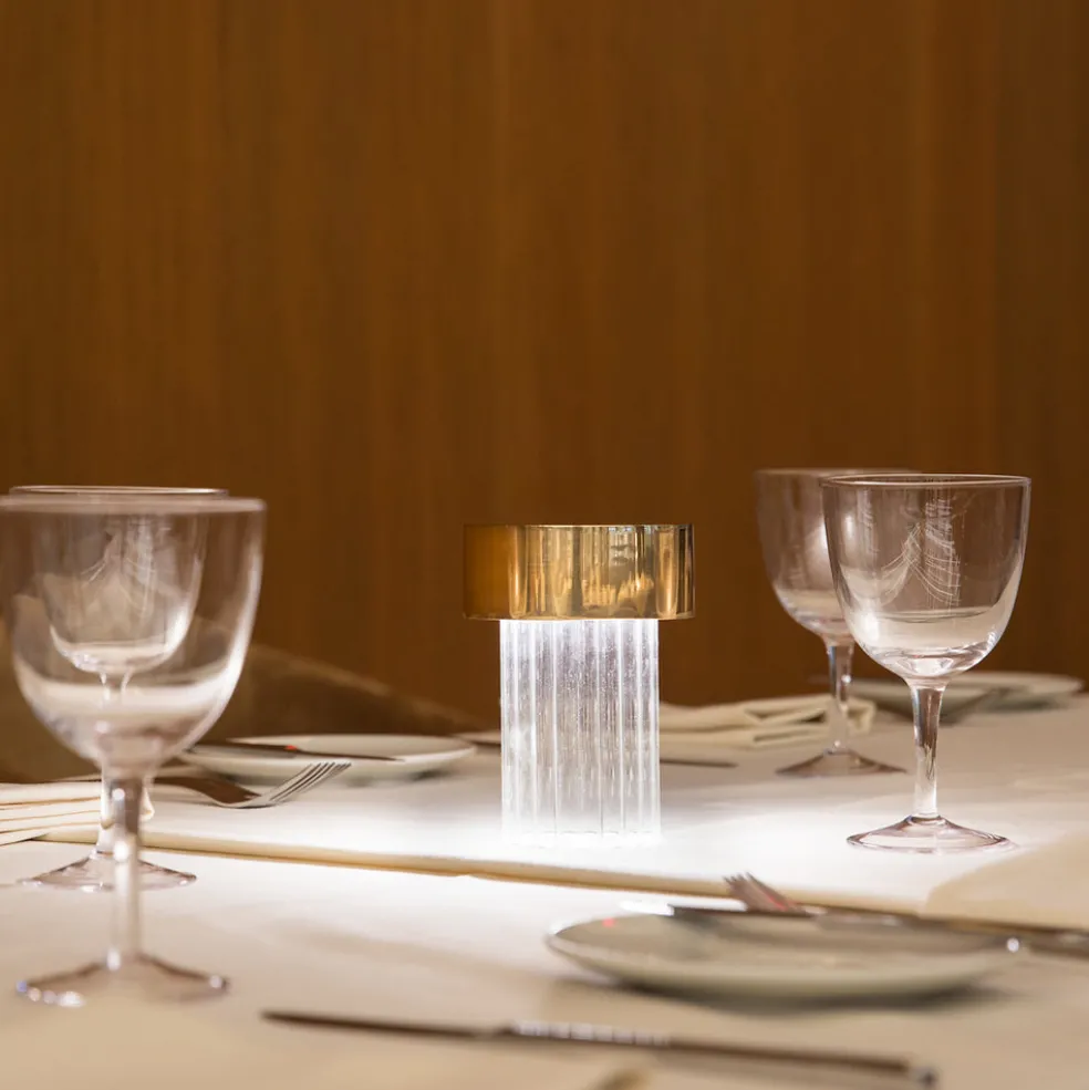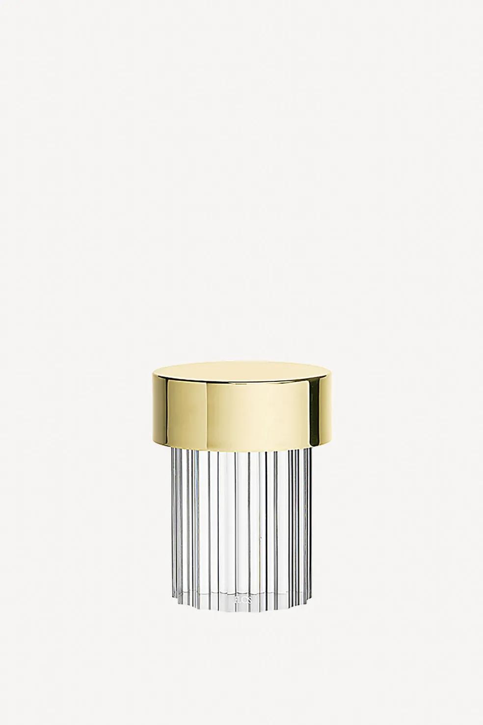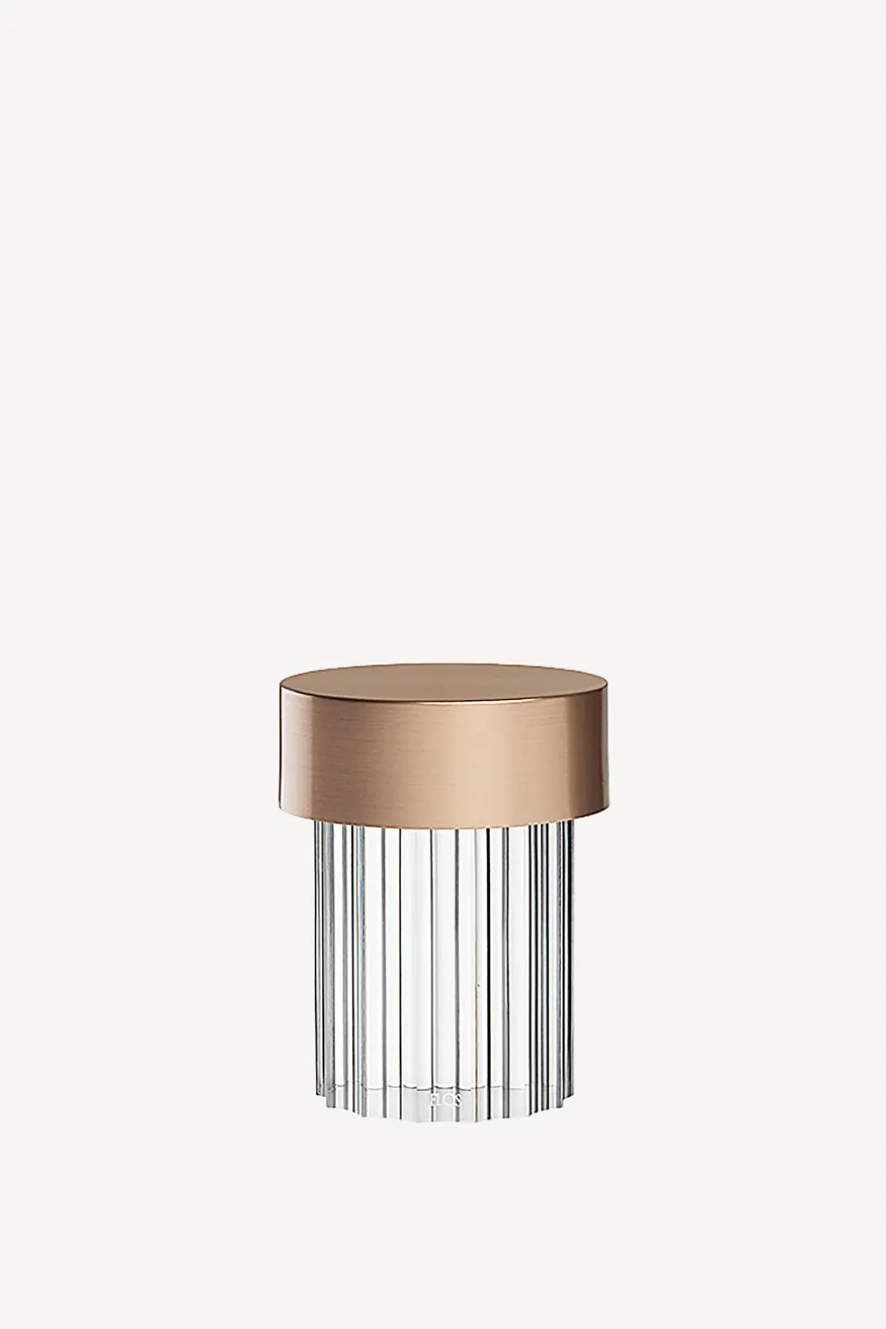 It is a rechargeable, portable table lamp that diffuses light through a transparent solid crystal base whose shape makes reference to architectural typology of the ancient column. The top cover comes in a combination of two different metal and color finishes: brass and satin copper.