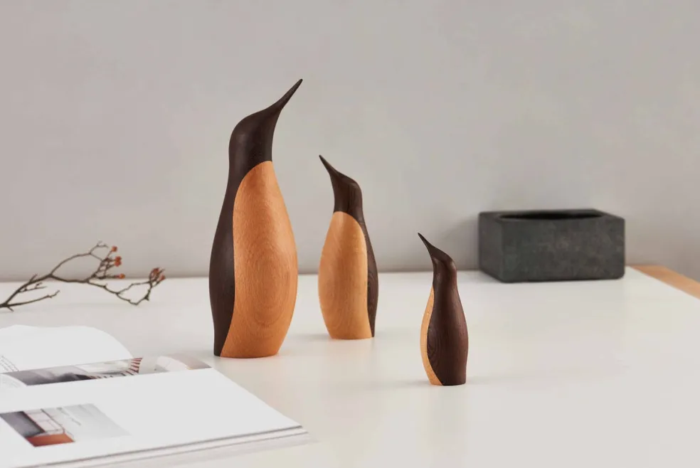 The Wooden Penguins designed by Hans Bunde in 1954, were originally created as personalized gifts for his daughters. Handcrafted from rich rosewood with delicate inlaid beaks and white belly accents, these timeless figures capture the elegance and simplicity of mid-century Scandinavian design. The Wooden Penguins, are available in three sizes and can stand alone as a single beautiful piece or be paired as a duo or a family to add a touch of character to any room.