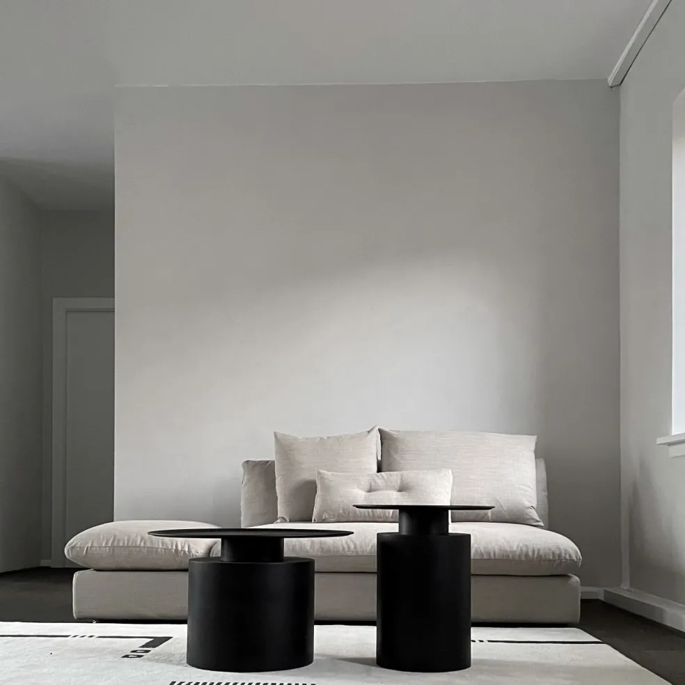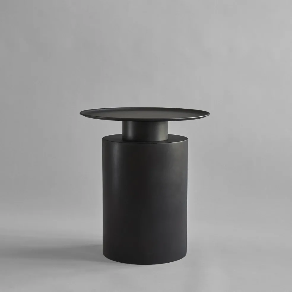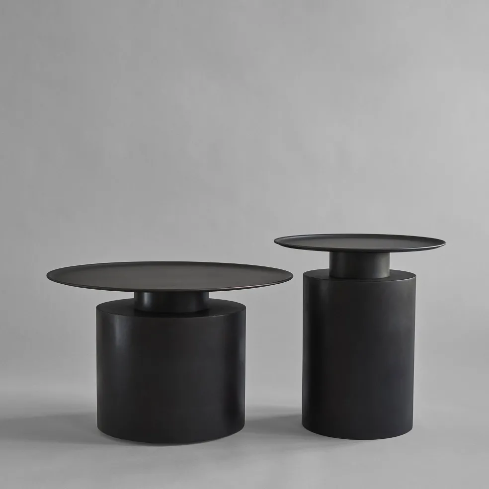 These tall and short coffee tables, designed by 101 Copenhagen and crafted in a gorgeous black burned plated metal, contain a contrast between a paper-thin tabletop and a voluminous base, embracing the very material from which the piece is crafted.