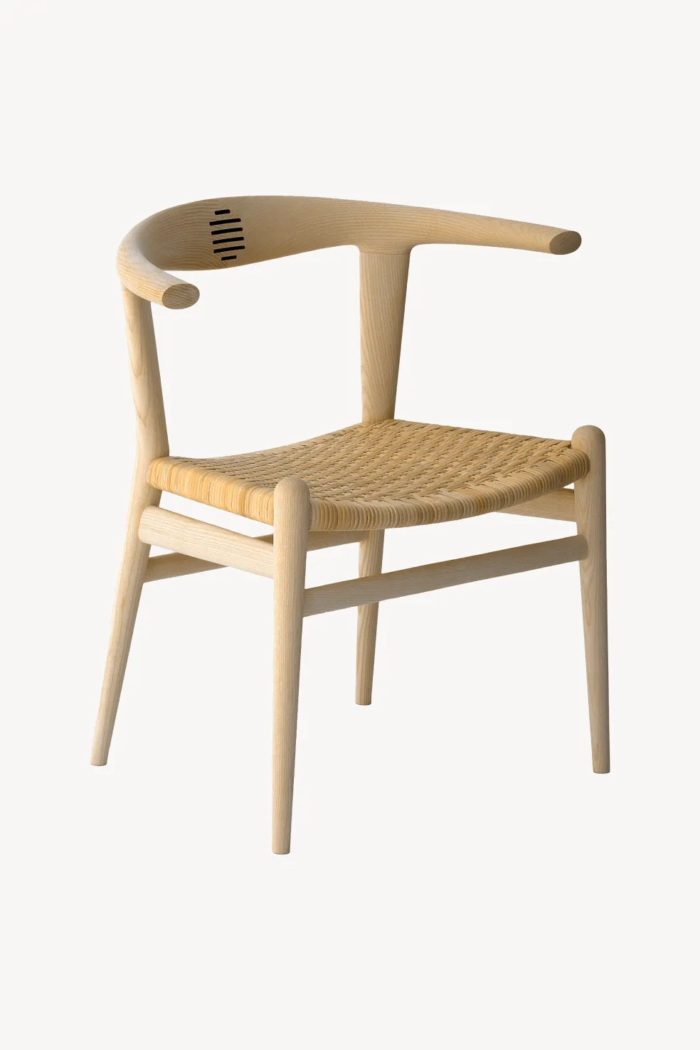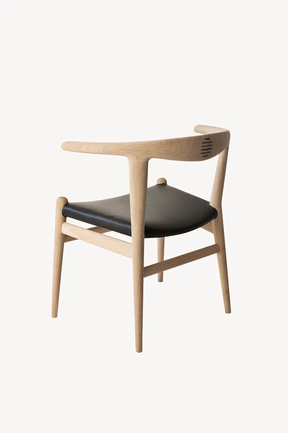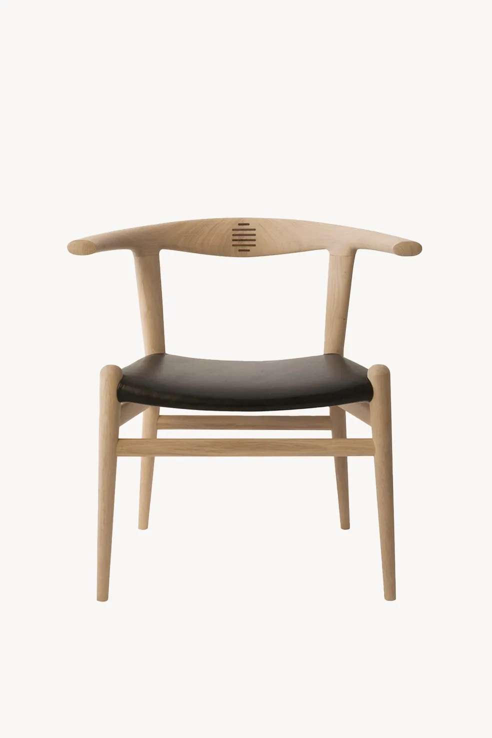 The PP518 Bull Chair by PP Møbler, designed by Hans J. Wegner in 1961, is a true masterpiece of Danish woodworking skill and design. Its distinctive backrest resembles bullhorns and is crafted from two curved pieces of solid wood each carved from 200 year old Danish shelter trees and joined seamlessly at the center with precision-crafted rosewood tenons. The armrests are cut from the same piece of wood to ensure a perfectly matching grain, highlighting the chair’s natural beauty and artistry. The tenon joints not only provide strength and elegance but are a signature feature that has become known as Wegner’s trademark. The Bull Chair is a bold statement piece that exudes craftsmanship, comfort and character.