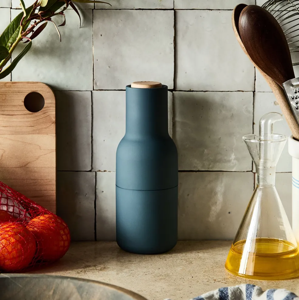 A unique and playful salt + pepper grinder set in a bottle shape. Available in a range of soft, Scandinavian colors and a smooth, matte finish, they’re as delightful to hold as they are to use. The upside-down design keeps your table clean, while the powerful ceramic grinder lets you season to perfection. Grind more than just salt and pepper including spices and grains, nuts, seeds or dried fruits. Designed by Norm Architects for MENU, Copenhagen.