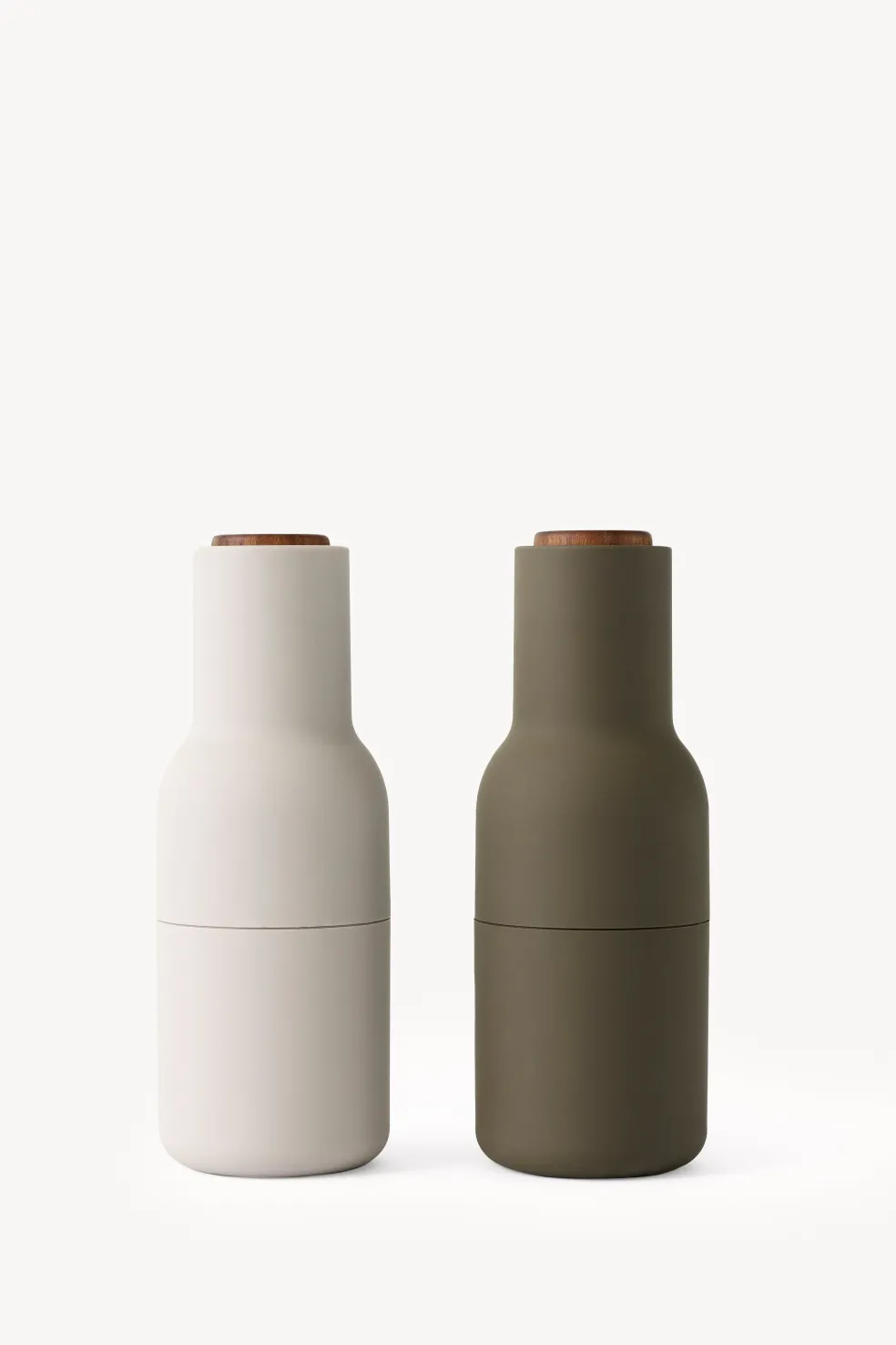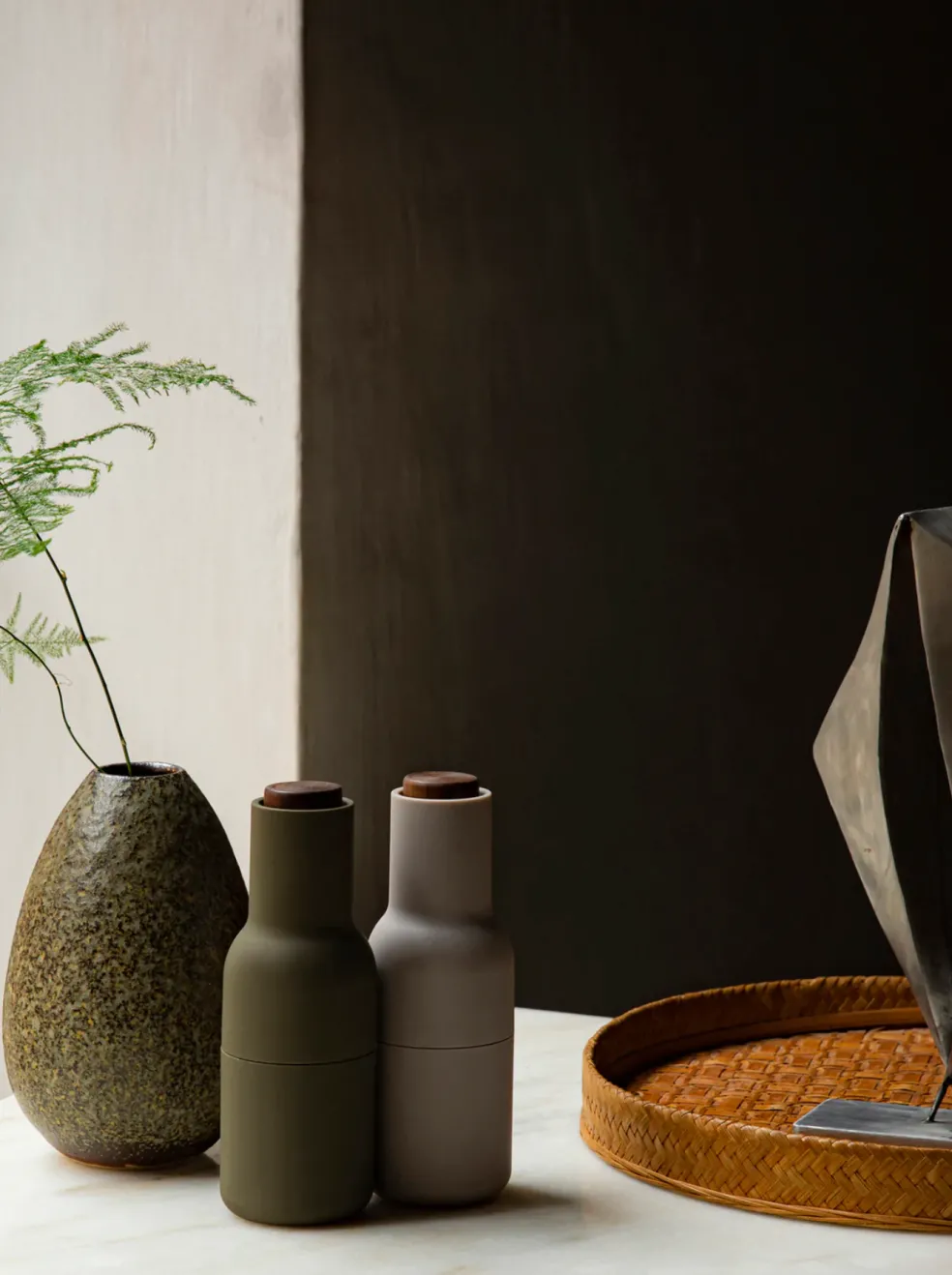 A unique and playful salt + pepper grinder set in a bottle shape. Available in a range of soft, Scandinavian colors and a smooth, matte finish, they’re as delightful to hold as they are to use. The upside-down design keeps your table clean, while the powerful ceramic grinder lets you season to perfection. Grind more than just salt and pepper including spices and grains, nuts, seeds or dried fruits. Designed by Norm Architects for MENU, Copenhagen.