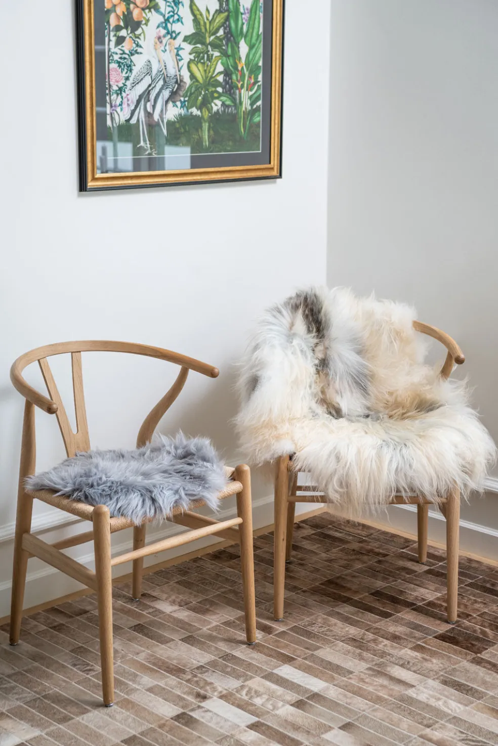 Circular sheepskin seat pads, made from merino wool, are ideal for barstools, benches, chairs, or any seating area that could use some fluffy padding and warmth. Merino wool is a natural temperature regulator with an amazing ability to provide a refreshing cool comfort in the summer, as well as a warm coziness in the winter. Designed in Denmark by Natures Collection.