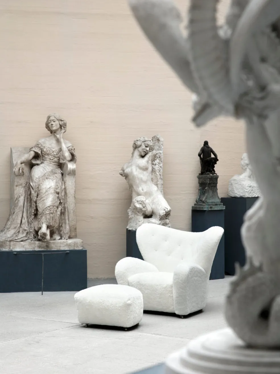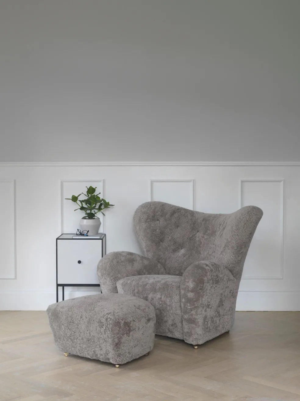 Bear-like with its curved form and voluminous armrests, sitting in this sheep fleece chair is “as warm and safe as a polar bear cub in the arms of its mother in the middle of the ice cap,” according to the Danish architect and designer.