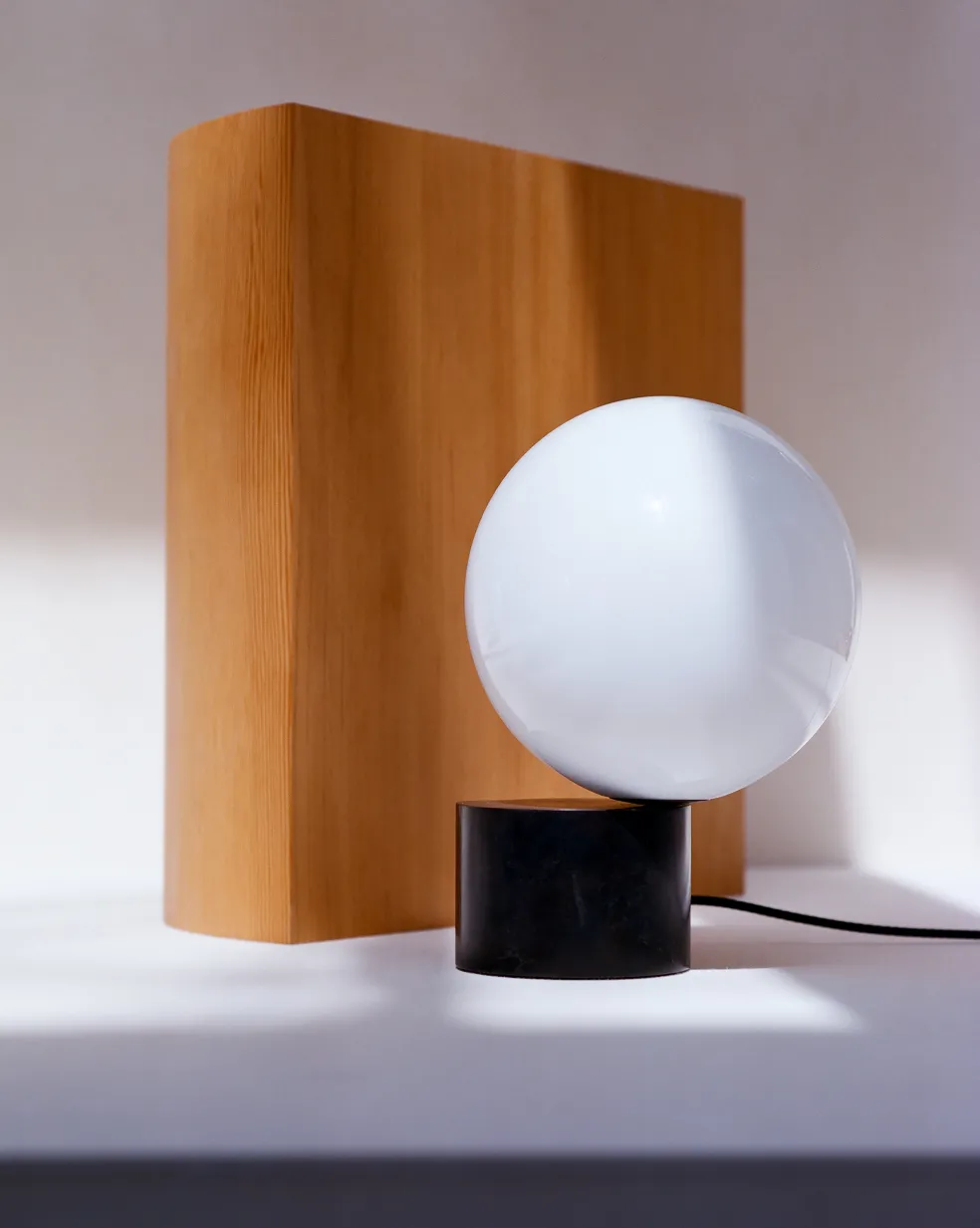 This intriguing table lamp is an illusion of balance, with a mouth-blown sphere of glass that appears to roll down the edge of a solid polished brass base. It has two lighting settings, a more dim ambient light and a brighter task light, allowing its user to experience multiple moods. Available in a polished brass, polished nickel-plated brass, and a black painted brass.