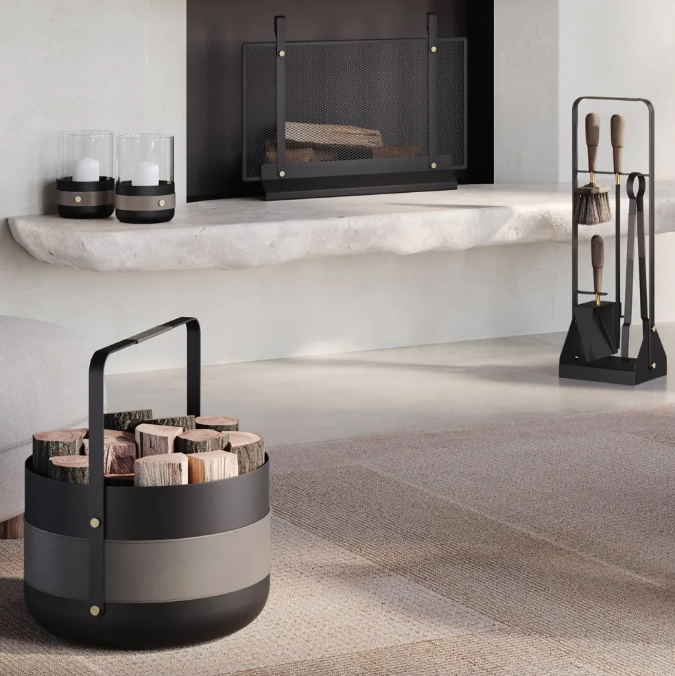 This elegant firewood basket is handcrafted from rich charcoal powder-coated steel, warm grey hand-stitched leather, and solid brass detailing. Use this extraordinary basket not only as storage for firewood, magazines, pillows, and towels, but also as a statement piece in your hygge space. Available in a variety of luxurious color finishes. Designed in Sweden by Emma Olbers for Eldvarm.