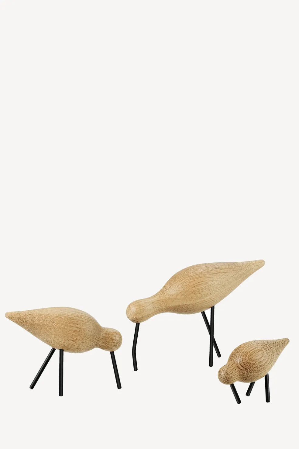 Shorebirds, crafted with solid oak and metal legs, are a classic Danish self accessory with simple silhouettes that give them a unique, joyful personality. Place the bird family of three on a sideboard or dresser where they can proudly perch alongside other decorative objects. Designed by Sigurjón Pálsson for Normann Copenhagen.