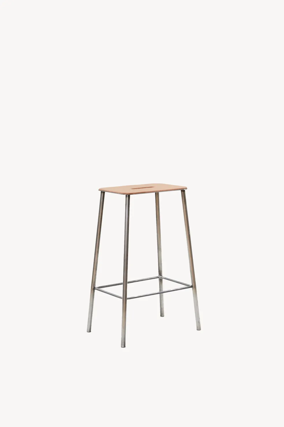 A classic industrial Danish design, this Adam Stool combines the natural materials of natural leather and steel. This handsome design by Toke Lauridsen works well in both classic and contemporary interiors and is a timeless piece that will last forever. The handle in the middle of the stool makes it easy to move around as needed, and footrests built into the legs create comfort so one may sit for long amounts of time.