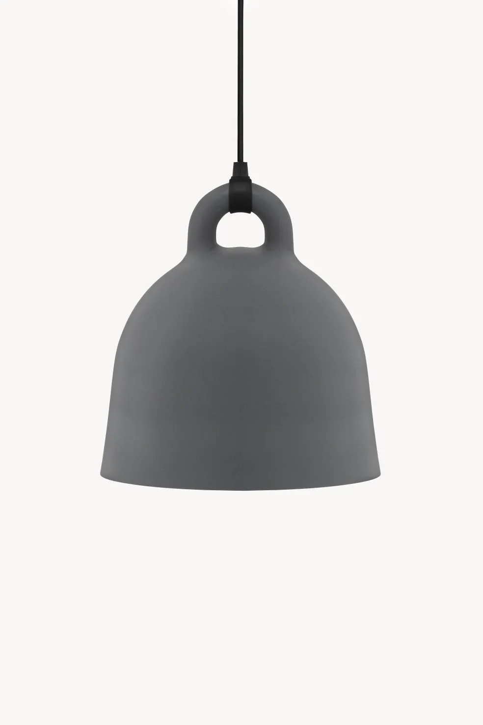 The Bell Lamp, by Normann Copenhagen, is a playfully modern take on the classic cow bell shape. Group together a mix of colors and sizes for a modern visual effect, use a large Bell Lamp as an accent pendant over the dinner table, or hang pairs of Bell Lamps for decorative kitchen lighting. Bell Lamps include corresponding textile cords and aluminum canopies, allowing them to match your unique interior design whether it be simple or bold. Low-energy 9 Watt bulbs are recommended.