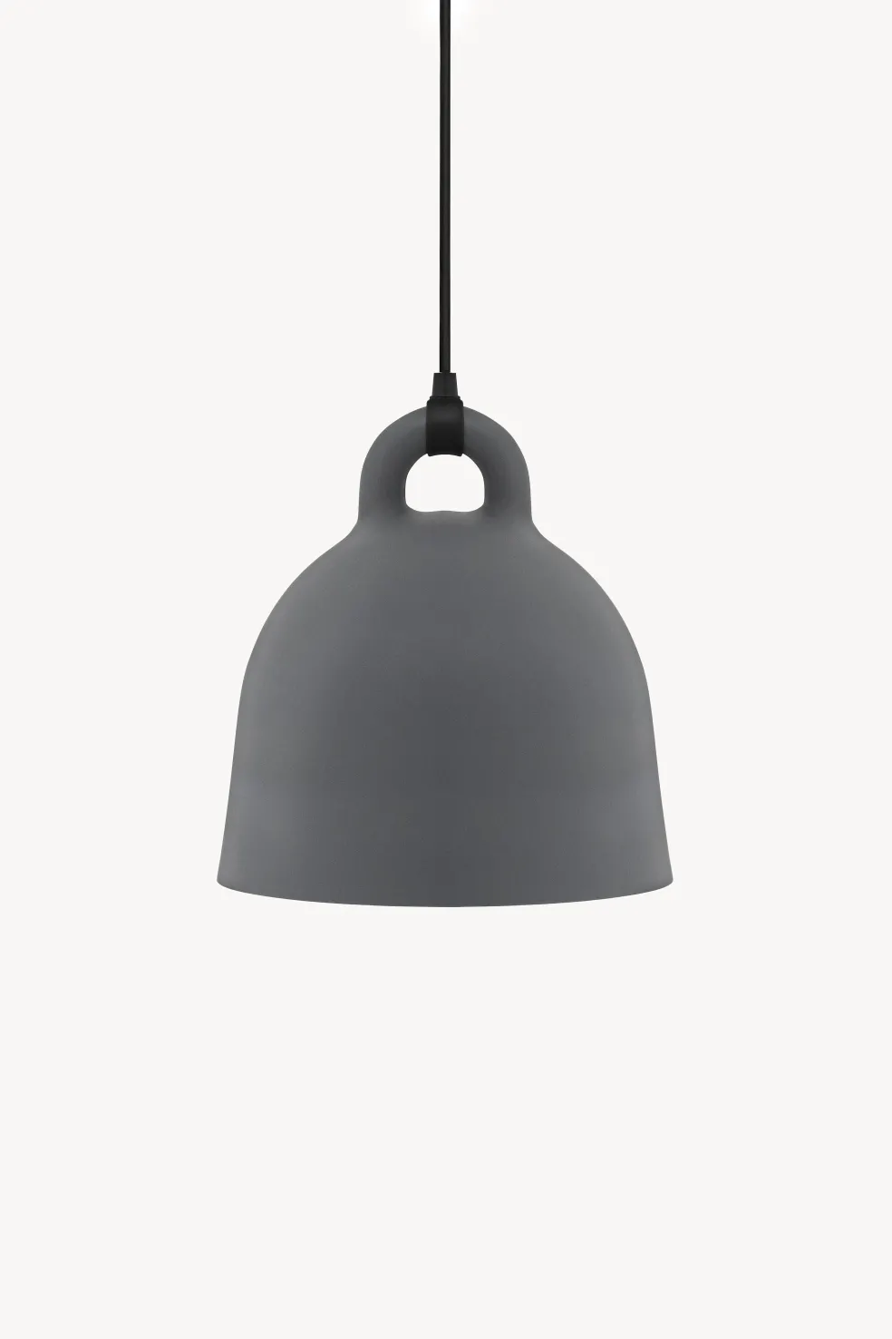 The Bell Lamp, by Normann Copenhagen, is a playfully modern take on the classic cow bell shape. Group together a mix of colors and sizes for a modern visual effect, use a large Bell Lamp as an accent pendant over the dinner table, or hang pairs of Bell Lamps for decorative kitchen lighting. Bell Lamps include corresponding textile cords and aluminum canopies, allowing them to match your unique interior design whether it be simple or bold. Low-energy 9 Watt bulbs are recommended.