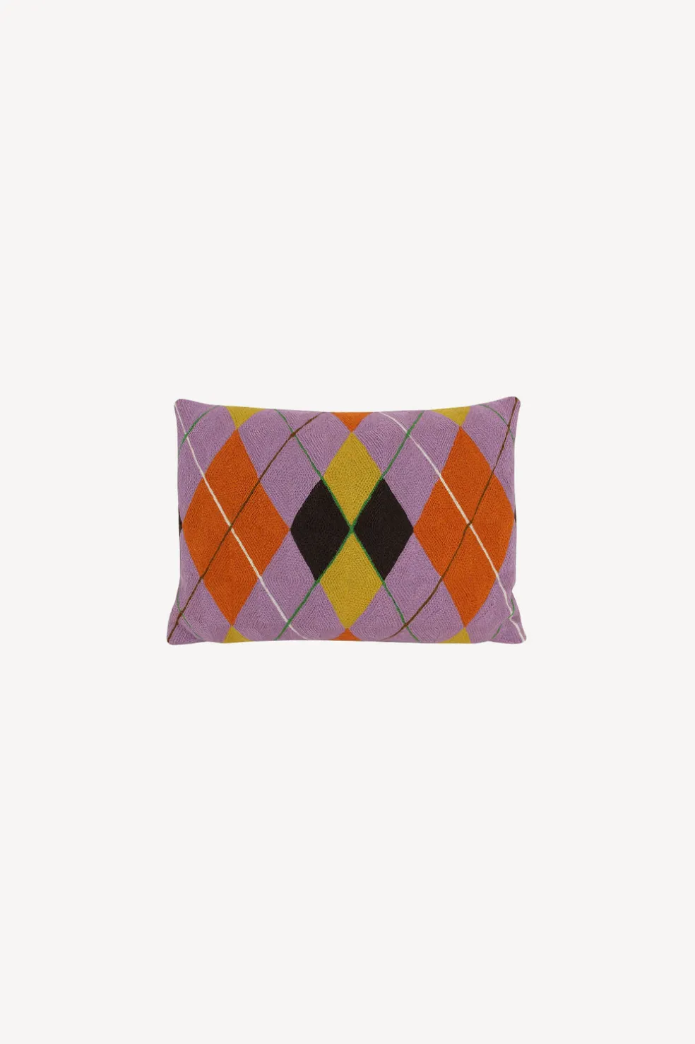 A Chattan argyle cushion hand embroidered in a chain stitch with a lovely lilac hue. Each piece is a unique creation with the embroidery, weaving, dyeing handcrafted by skilled artisans in northern India and Nepal.