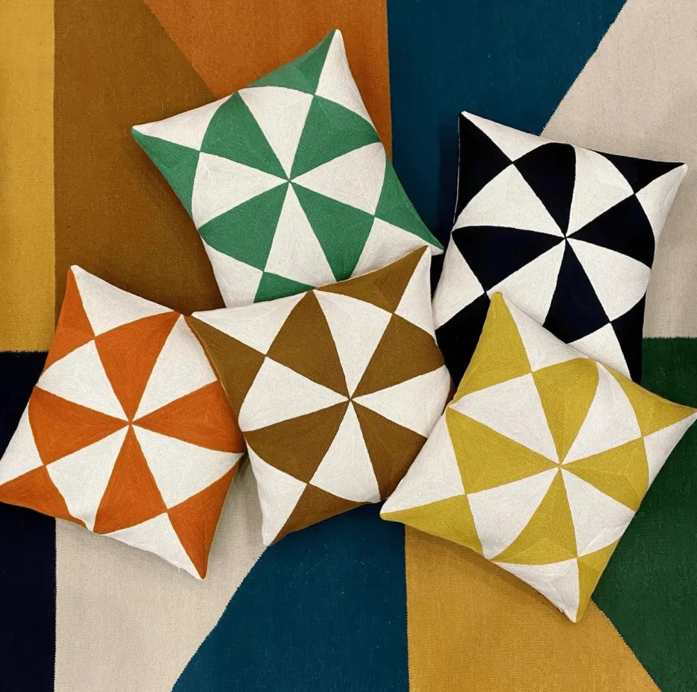 Lindell & Co, based in Paris, France, combines Scandinavian aesthetics with the designer’s in-depth knowledge of materials & embroidery techniques to create these uniquely colorful cushions with sophisticated, timeless geometric patterns. Although colorful, these sophisticated designs fit perfectly with any style, including neutral, minimalistic settings.
