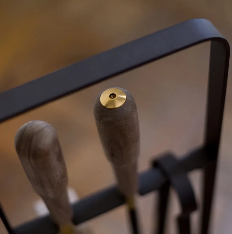 Handcrafted from dark warm gray powder-coated steel, walnut wood, horse hair, and solid brass details, this fireplace set includes a stylish blow poker, brush, shovel, and tongs. Each tool has its own function, but is part of a coherent fire tool set that is a pleasure to use, looks stunning next to any fireplace, and can be enjoyed for generations.