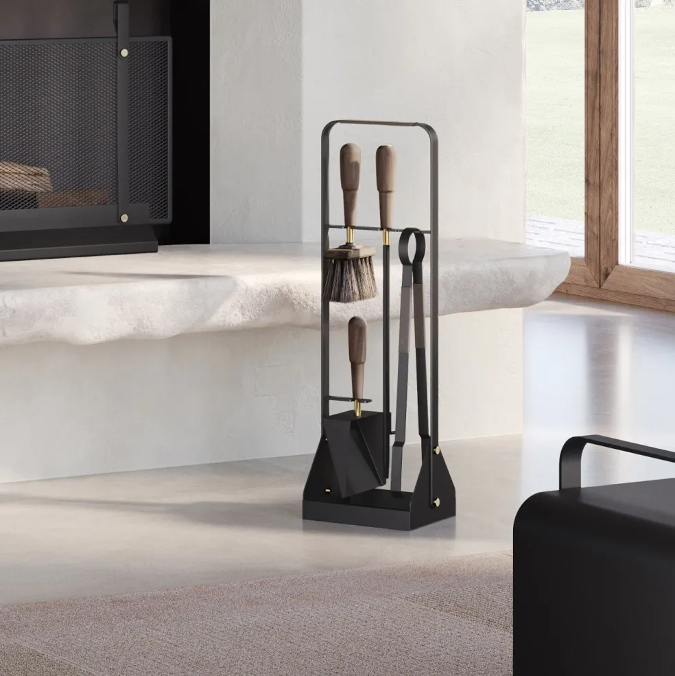 Handcrafted from charcoal powder-coated steel, walnut wood, horse hair, and solid brass details, this fireplace set includes a stylish blow poker, brush, shovel, and tongs. Each tool has its own function, but is part of a coherent fire tool set that is a pleasure to use, looks stunning next to any fireplace, and can be enjoyed for generations.