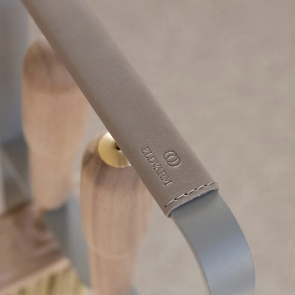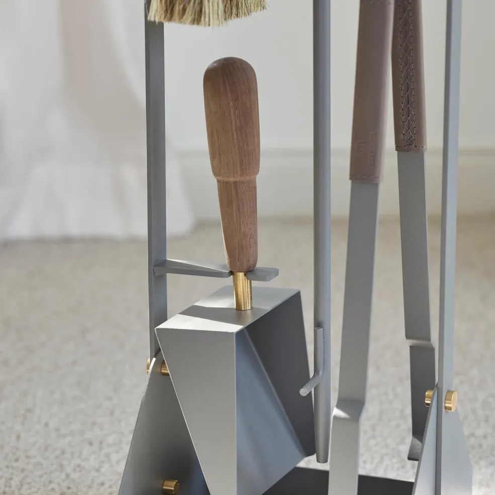Handcrafted from an elegant light gray powder-coated steel, natural tanned leather, walnut wood, horse hair, and solid brass details, this fireplace set includes a stylish blow poker, brush, shovel, and tongs. Each tool has its own function, but is part of a coherent fire tool set that is a pleasure to use, looks stunning next to any fireplace, and can be enjoyed for generations.