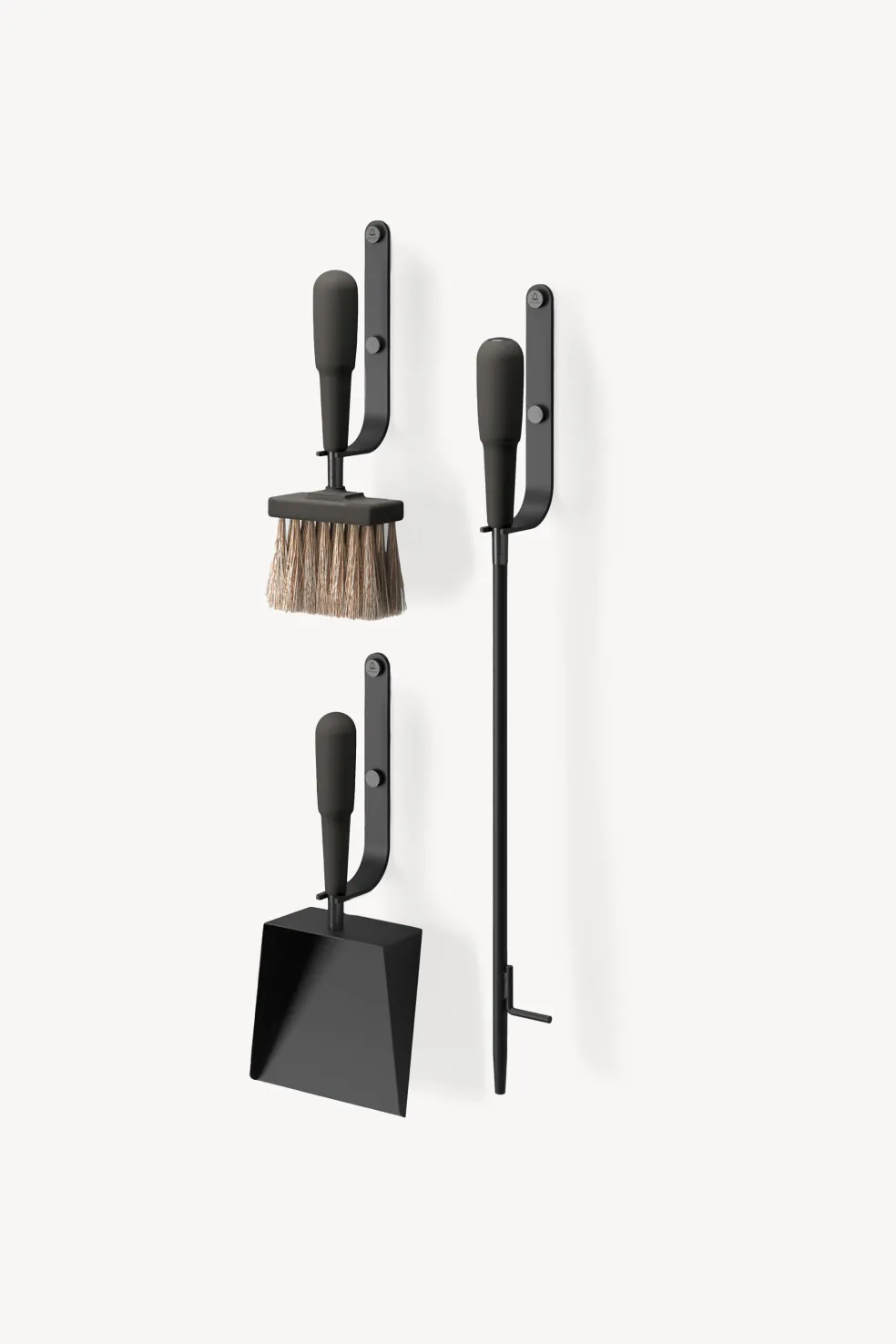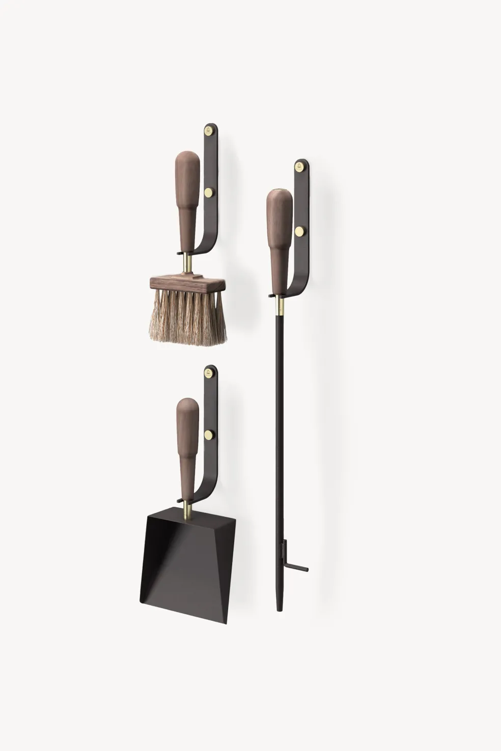 Handcrafted from powder-coated steel, natural leather, wood, horse hair, and solid brass details, this wall hung fireplace set includes a stylish blow poker, brush and shovel.