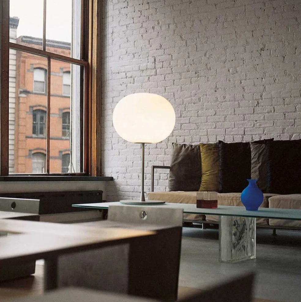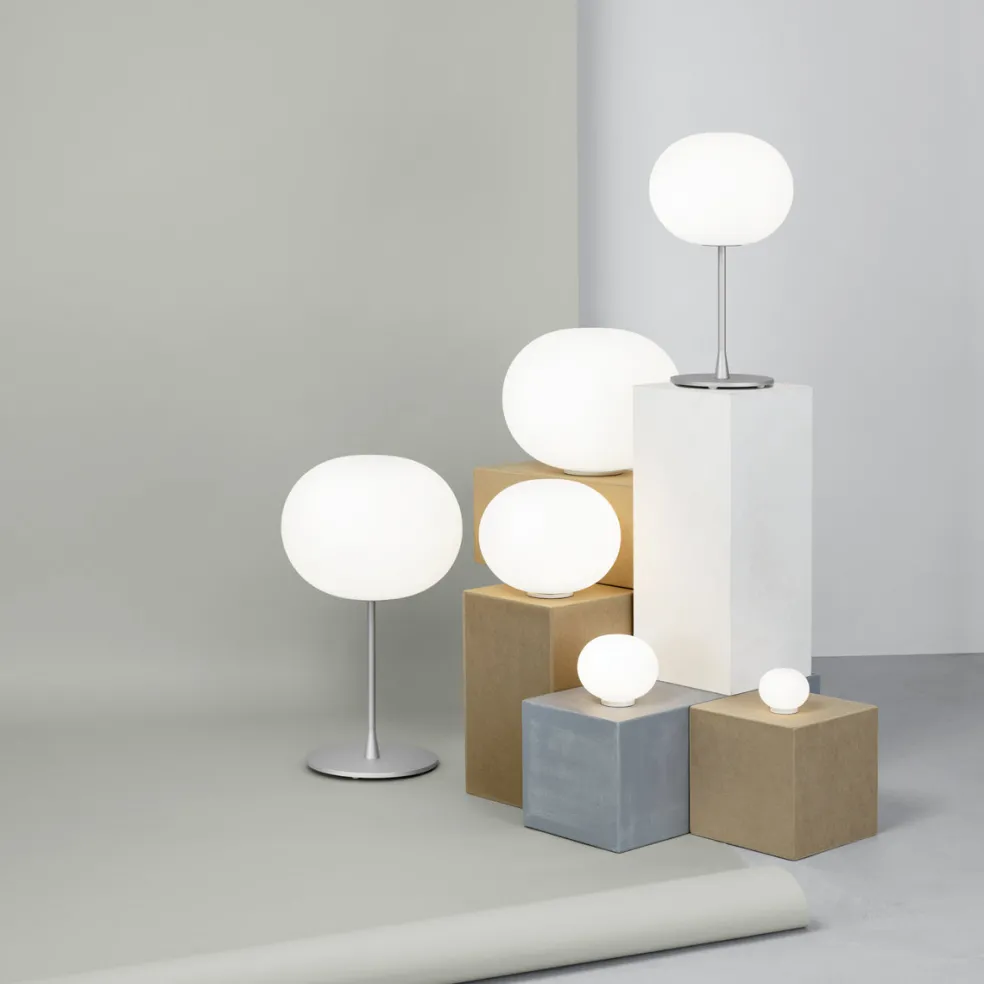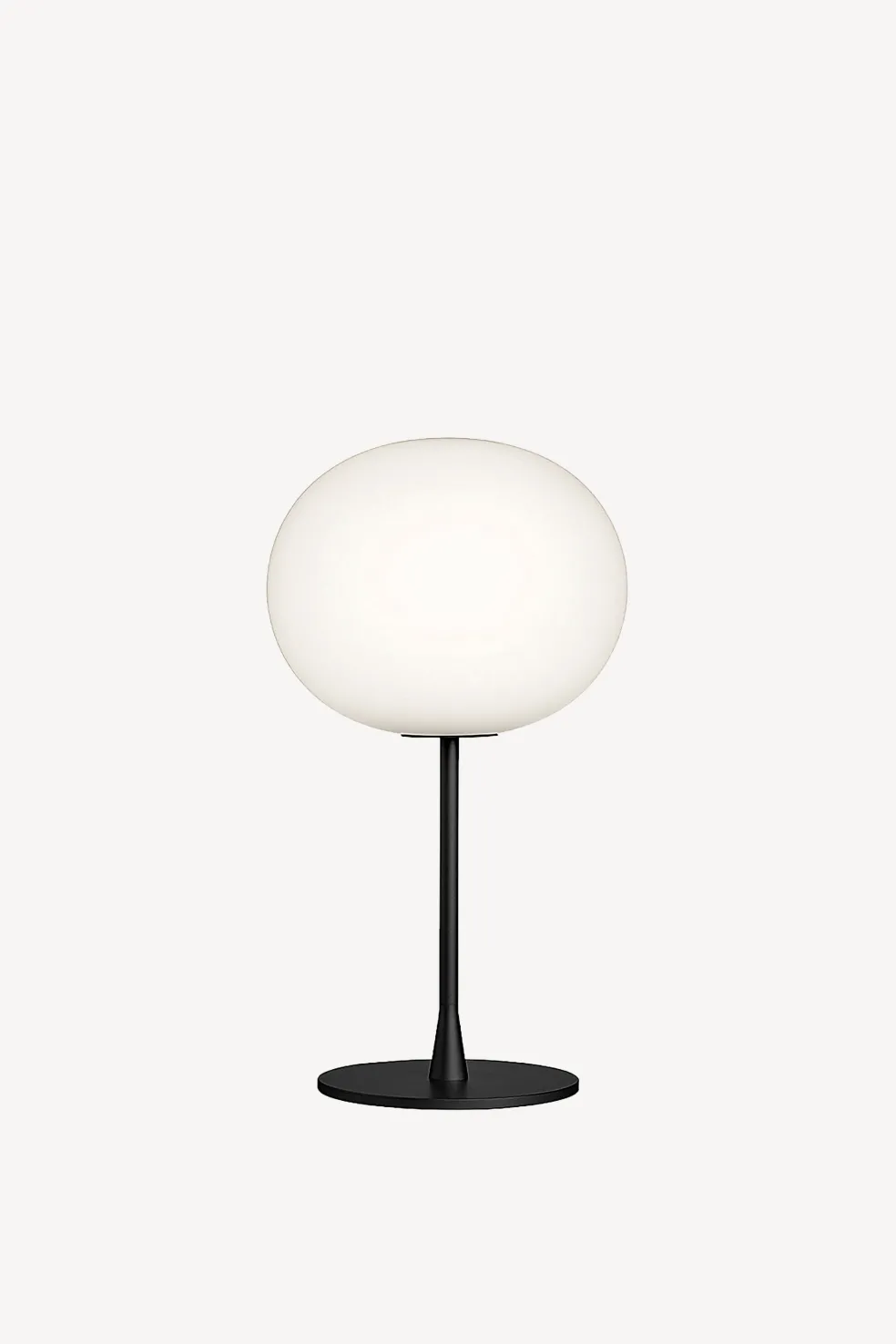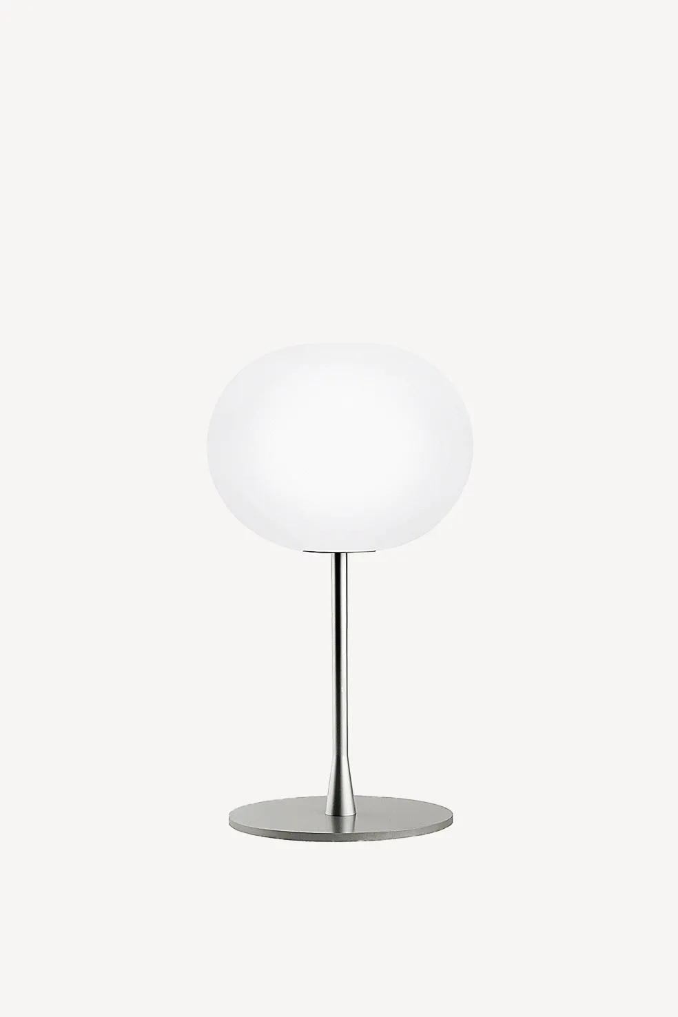 This contemporary, table lamp with a short stem fits beautifully into any space, emitting a warm, diffused light that is delicate yet vibrant. The dimmable Glo-Ball, a hand-blown, etched white opaline glass diffuser, is supported by your choice of a matte black or silver steel stem.