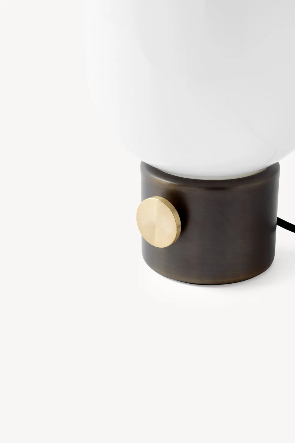 Bronzed brass base, golden steel knob, and opal glass.