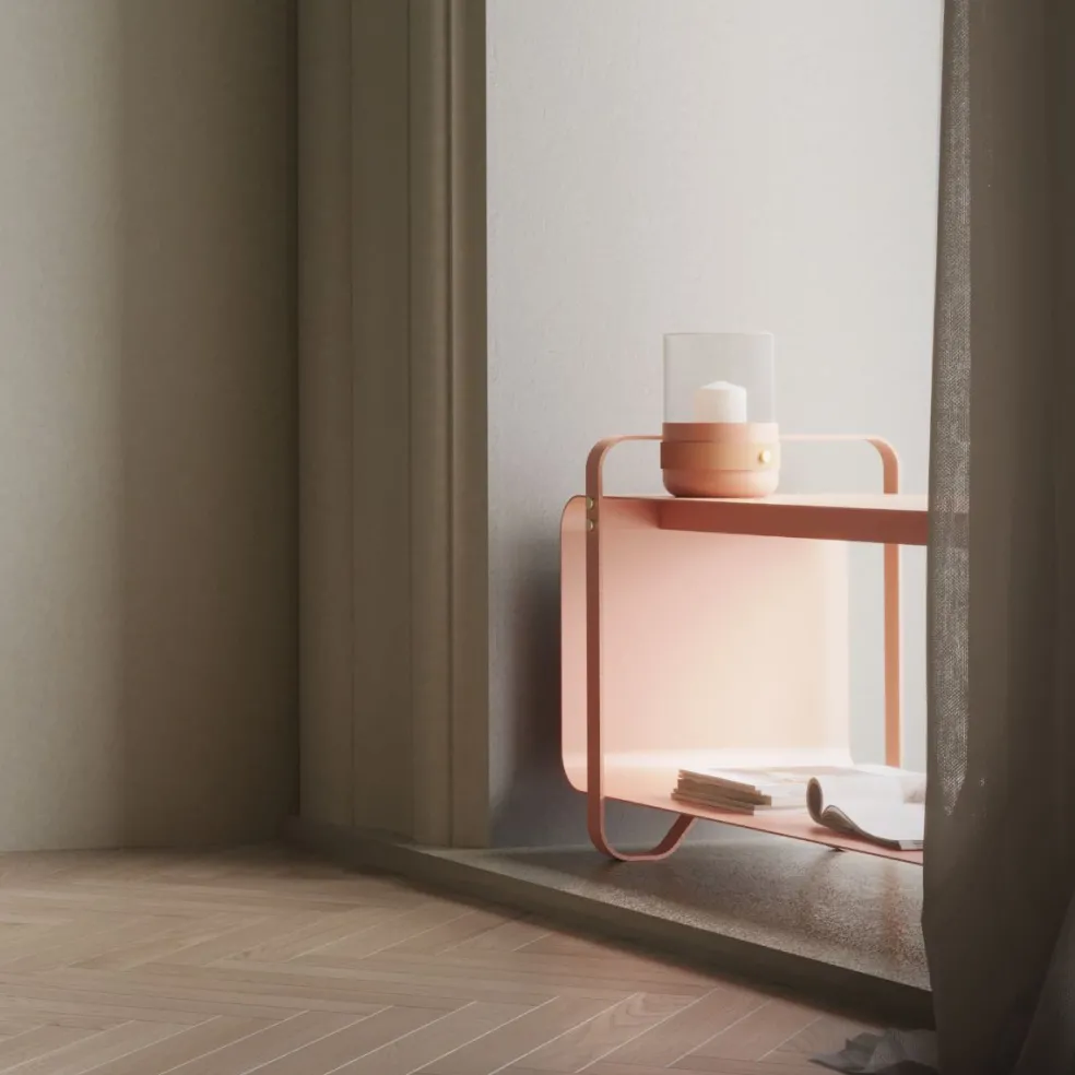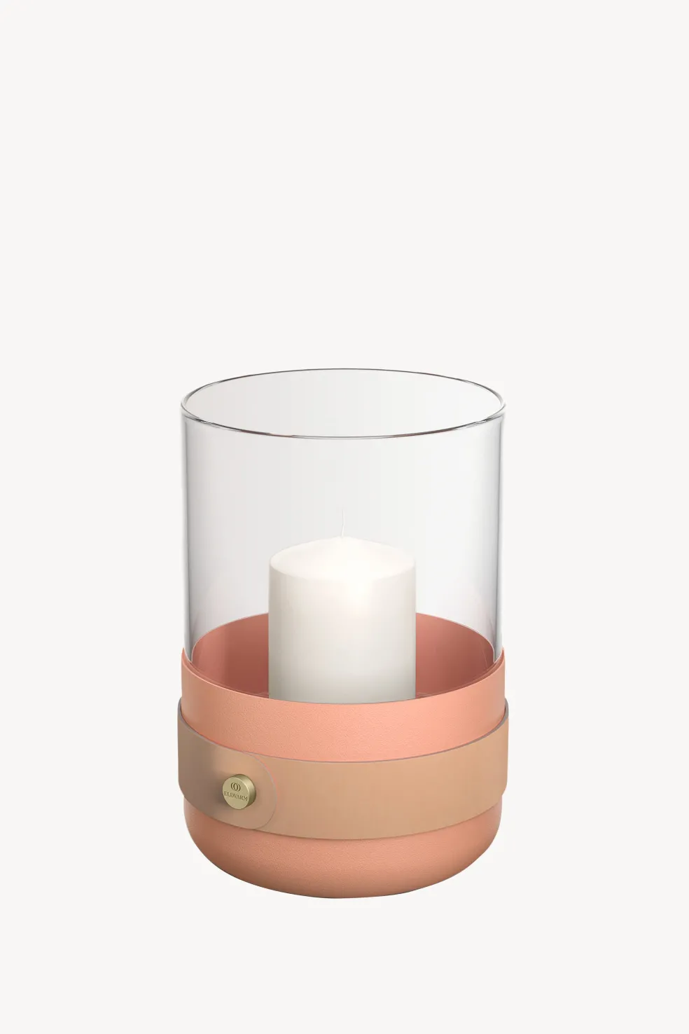 The Emma lantern is artfully crafted from soft coral powder-coated steel, as well as rich cognac leather, hand-blown glass, and solid brass detailing. Available in a variety of luxurious color finishes. Designed in Sweden by Emma Olbers for Eldvarm.