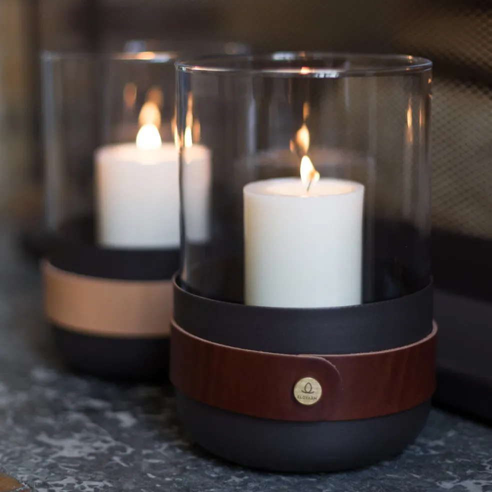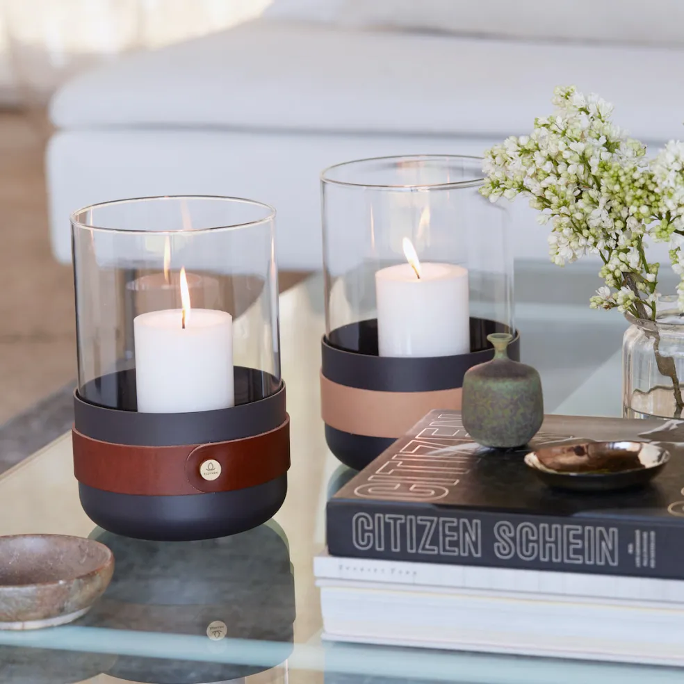 The Emma lantern is artfully crafted from an earthy brown powder-coated steel, as well as rich cognac leather, hand-blown glass, and solid brass detailing. Available in a variety of luxurious color finishes. Designed in Sweden by Emma Olbers for Eldvarm.