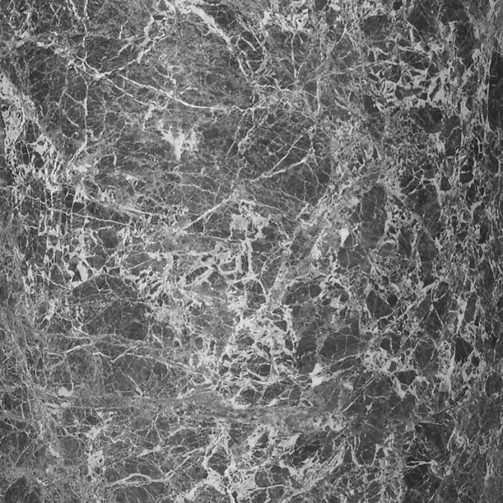 The top is a in a grey Emperador marble and the base is a veneer oak, black lacquered.