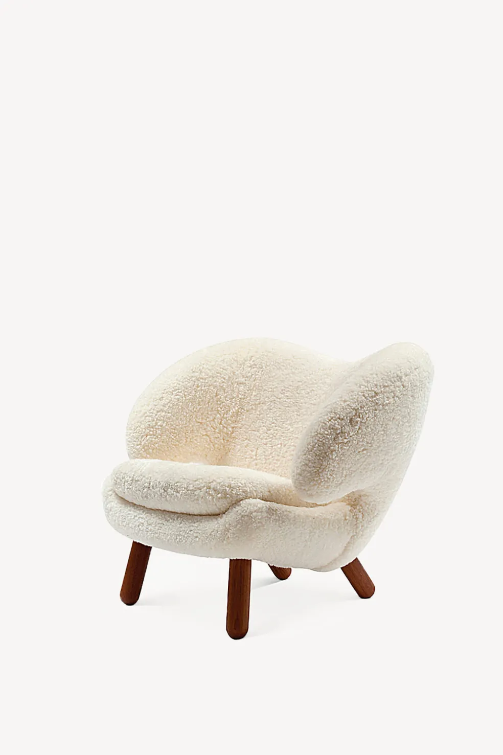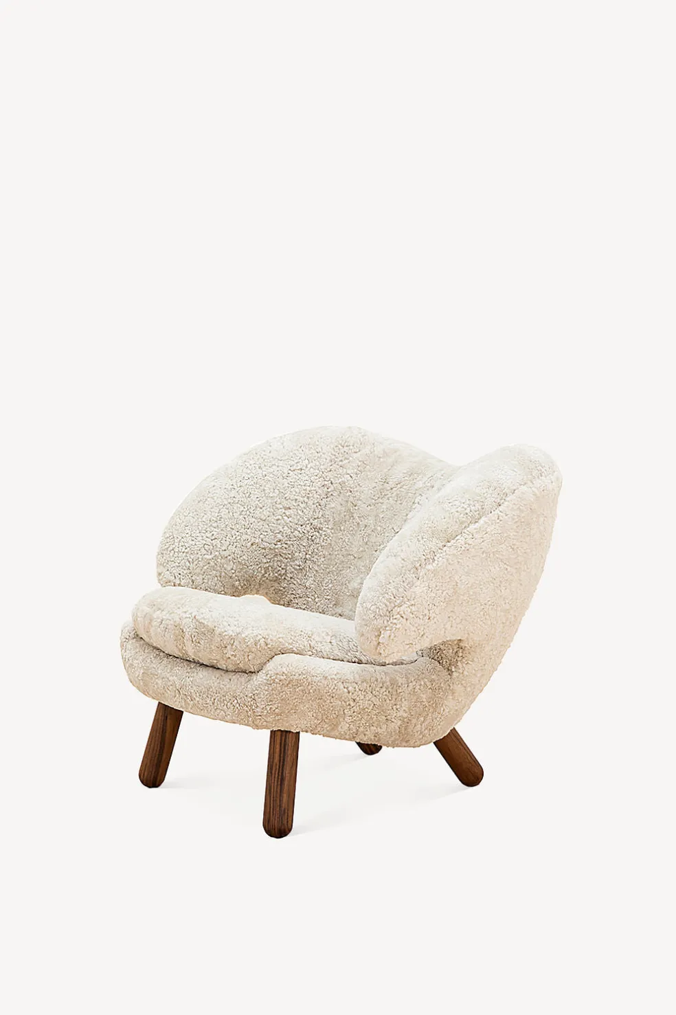 The Pelican Chair is available in many upholstery options, although we highly recommend this chair in the Gotland sheepskin material due to the naturally warm feel of sheepskin that further evokes the feeling of being embraced when sitting. It is available with walnut, oak or black stained legs.