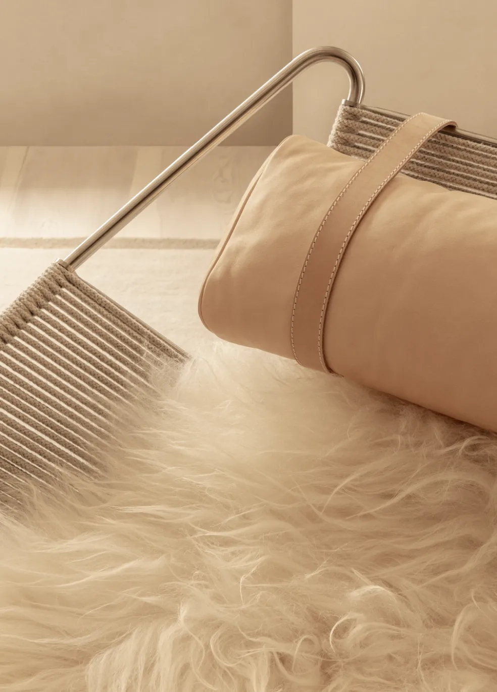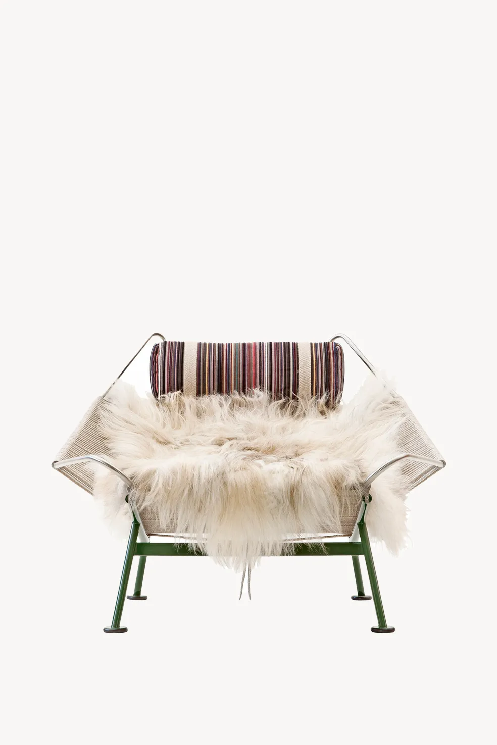 While the Flag Halyard Chair has a wonderfully contemporary aesthetic the original design was conceived by Hans Wegner in 1950. One idyllic Summer afternoon, while the children were playing on the Danish coast, Wenger began to form the concept of this chair right there in the sand. He later went home to sketch out the design of the seating angles he had created on the beach to form the ultimate lounge chair. The Flag Halyard chair showcases a unique design, as the majority of the chair is diligently woven with 240 meters of continuous halyard flag roping, making it as comfortable as it is durable. Available in multiple options and colors, each chair is made with a solid stainless steel frame, a cozy pillow and can be lined with a long-haired sheepskin to soften the industrial sharpness of the steel. The Flag Halyard Chair is the perfect blend of sophistication and comfort.
