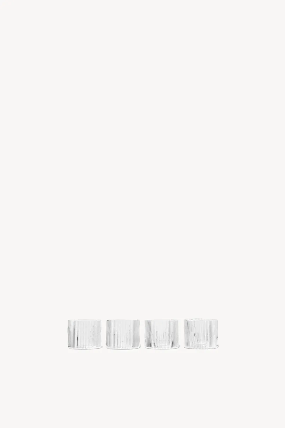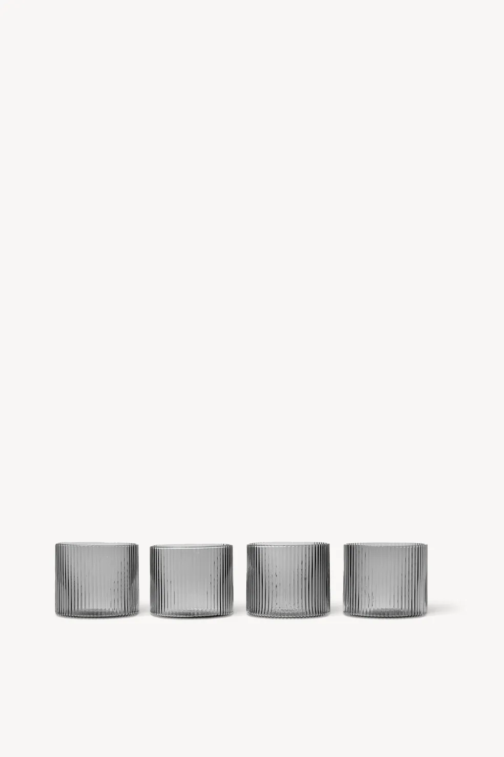 Ripple Water Glasses are a lovely example of moulded and mouth-blown glass. This process of design gives a polished and distinctive appearance with a ripple surface, while showcasing artistic creativity. The Ripple Water Glasses come in a set of four and are offered in clear or smoke hue. This lovely, low profile glassware adds character and charm to any occasion. Pair them with other pieces in the Ripple Glassware collection for a cozy and cohesive dining experience.