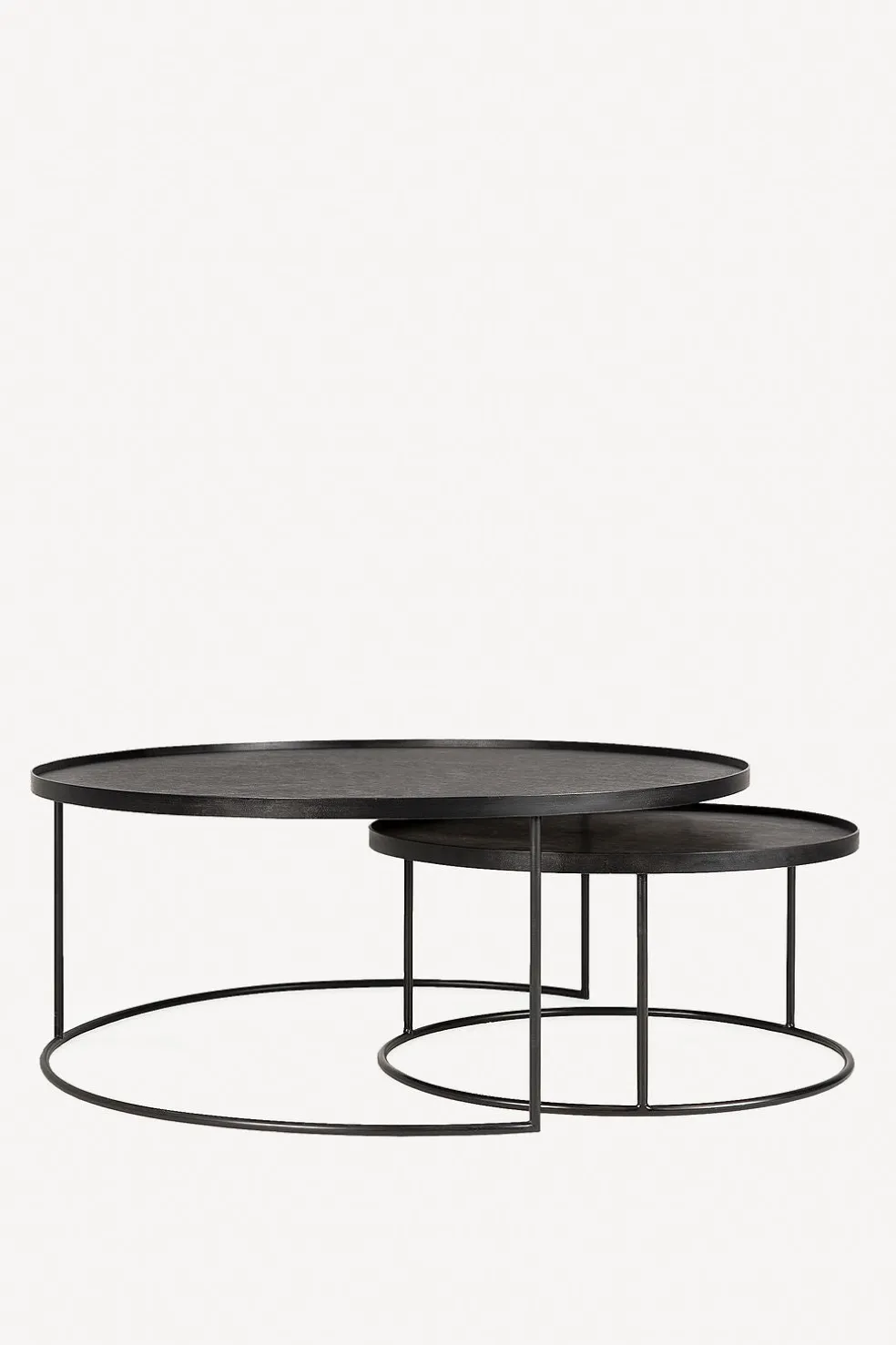 These tables are sold as a set of two. The tables are made from black-tainted wood with a water-based varnish finish and a black metal frame. They are meant to be combined with a small and large round tray, which must be ordered separately.