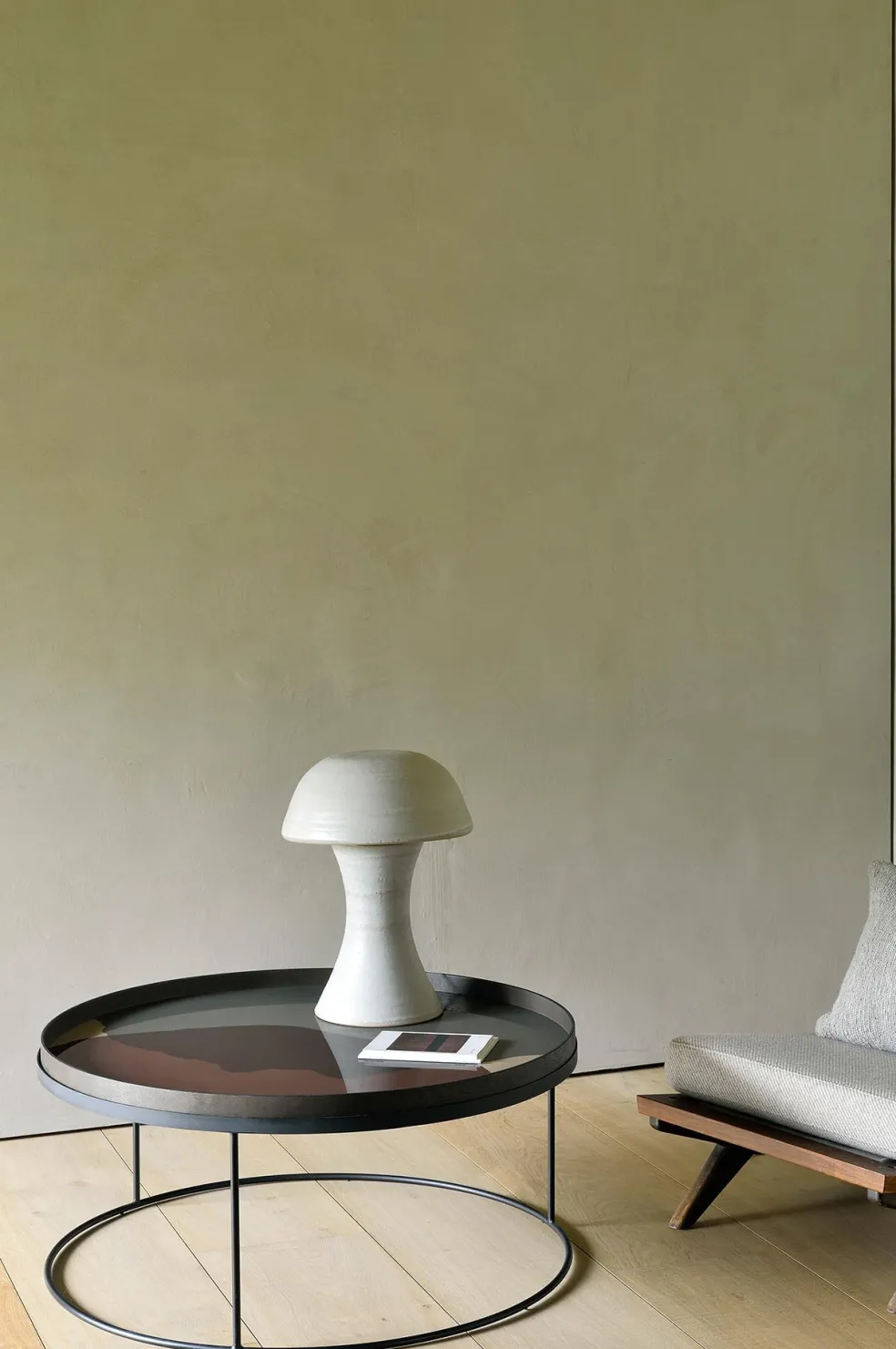 The table is made from black-tainted wood with a water-based varnish finish and a black metal frame. It is meant to be combined with an extra large round tray.