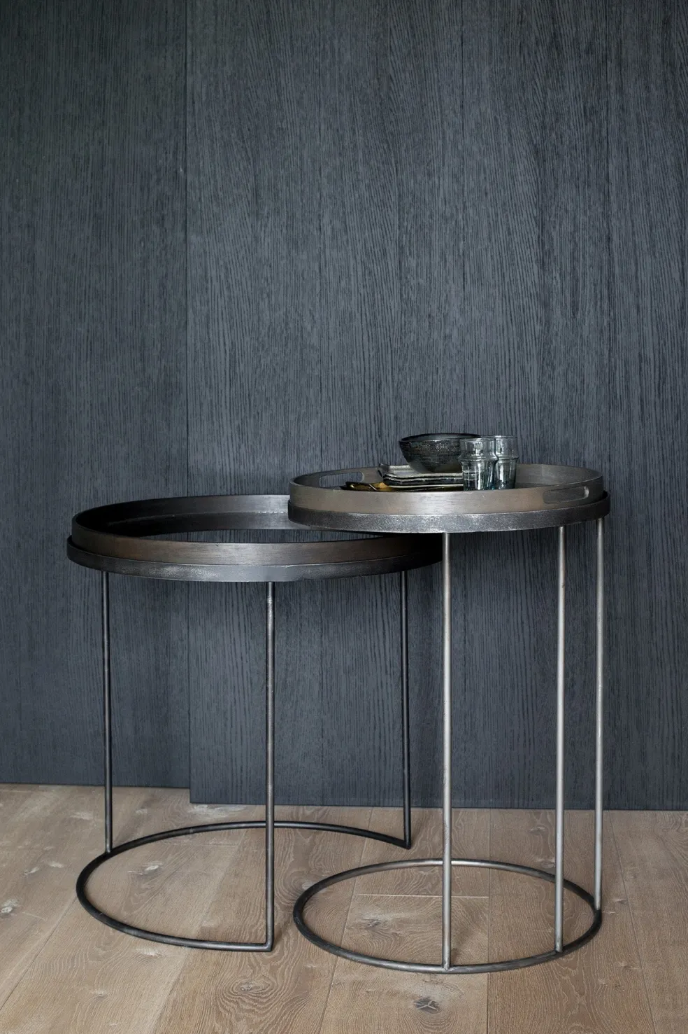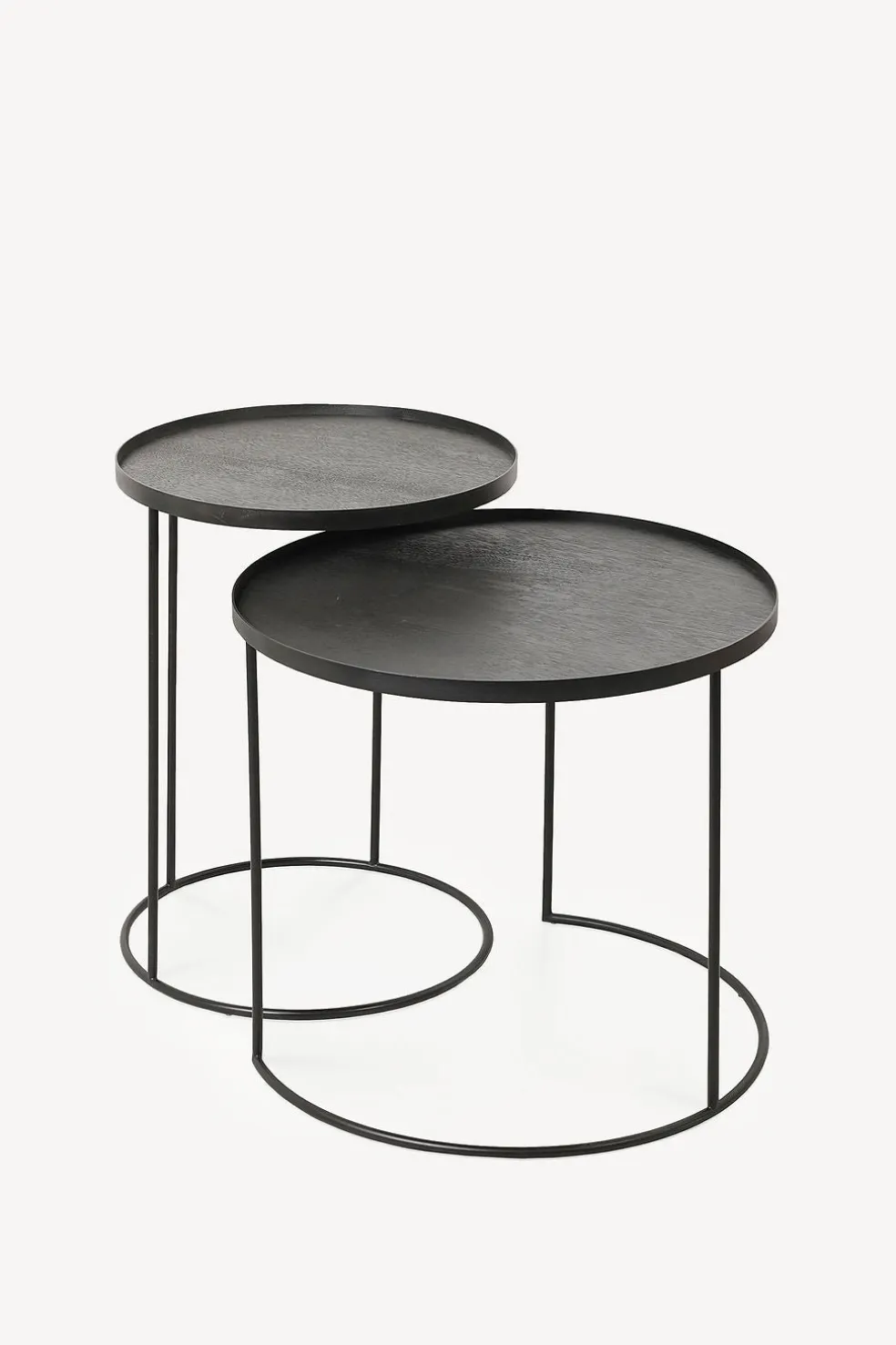 These tables are sold as a set of two. The tables are made from black-tainted wood with a water-based varnish finish and a black metal frame. They are meant to be combined with a small and large round tray, which must be ordered separately.