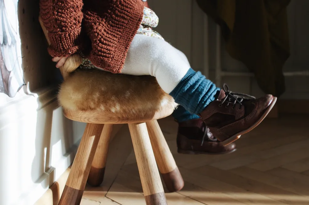 This children’s stool is a work of art and incredibly cute. Crafted from fine solid European oak and American walnut with a foam stool, and upholstered in cozy faux fur by EO in Denmark.