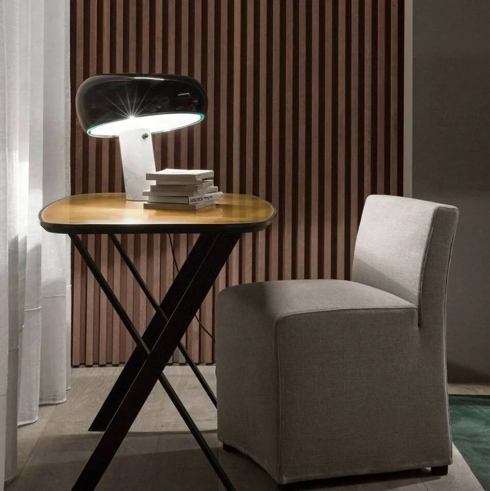 The Snoopy modern desk lamp provides direct light through its thick glass disk and enameled reflector, both resting in perfect balance on a marble base. Choose your favorite color, use the dimmer to set your desired task light, and enjoy this vibrant, playful work of art.