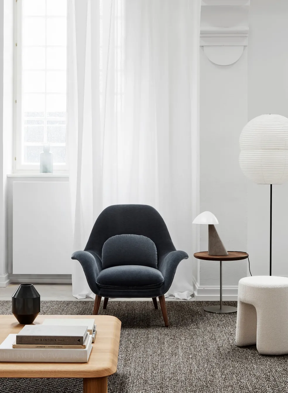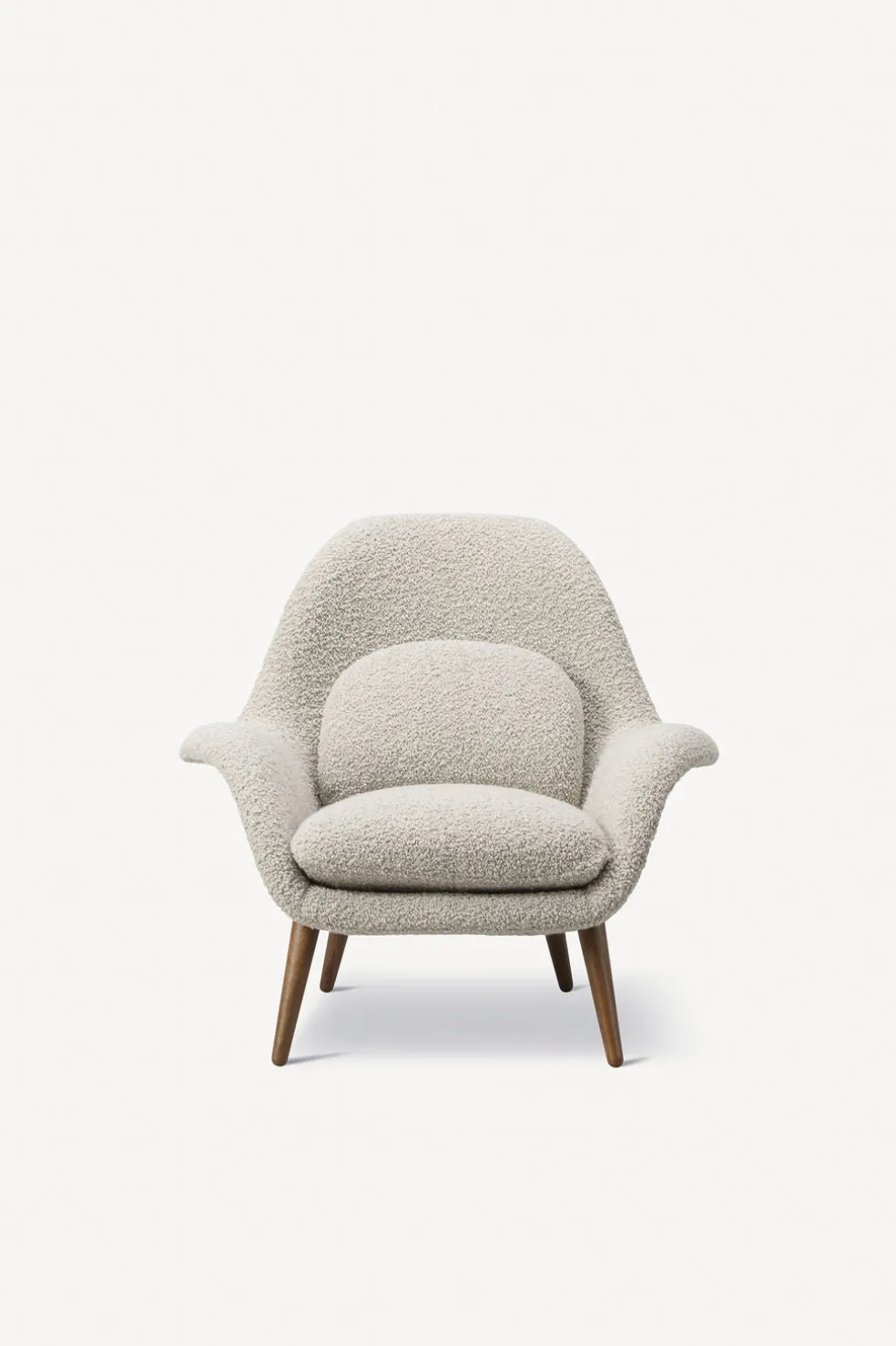 Designed to inspire living life at a slow pace, Space Copenhagen have created the Swoon lounge chair and ottoman as an invitation to luxuriate in comfort. Beautiful for a master bedroom, reading corner or elegant living room, this chair presents many fun interior design opportunities. It is available in a wide range of upholsteries, including velvet and bouclé, which both look stunning on this piece.