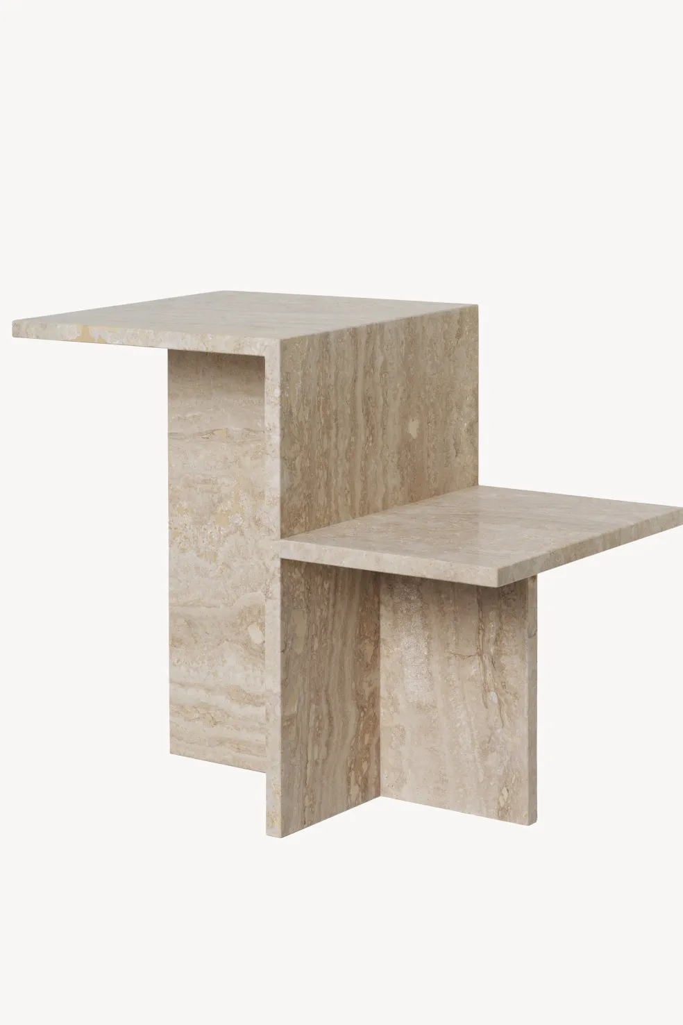 The Travertine Side Table is inspired by Japanese minimalism. This piece is a lovely example of complex elements fashioned on a single structure. It is made from travertine, a highly durable material formed by natural hot springs and limestone deposits. The notable planes of contemporary design illuminate the earthy quality and rich character of the travertine, making this piece a beautiful and distinctive statement.