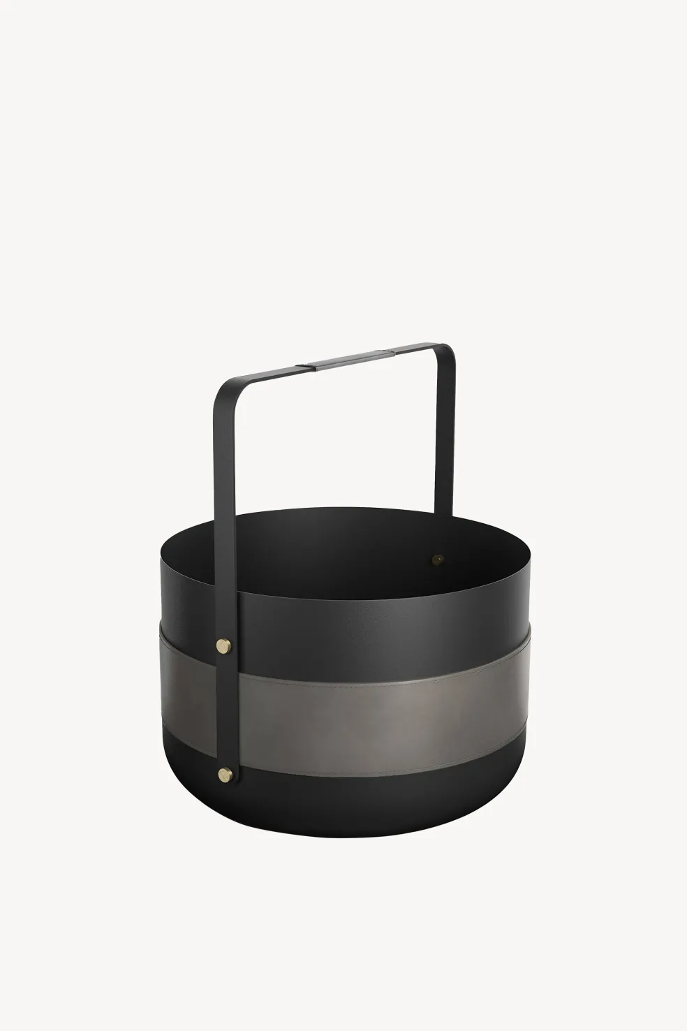 This elegant firewood basket is handcrafted from rich charcoal powder-coated steel, warm grey hand-stitched leather, and solid brass detailing. Use this extraordinary basket not only as storage for firewood, magazines, pillows, and towels, but also as a statement piece in your hygge space. Available in a variety of luxurious color finishes. Designed in Sweden by Emma Olbers for Eldvarm.